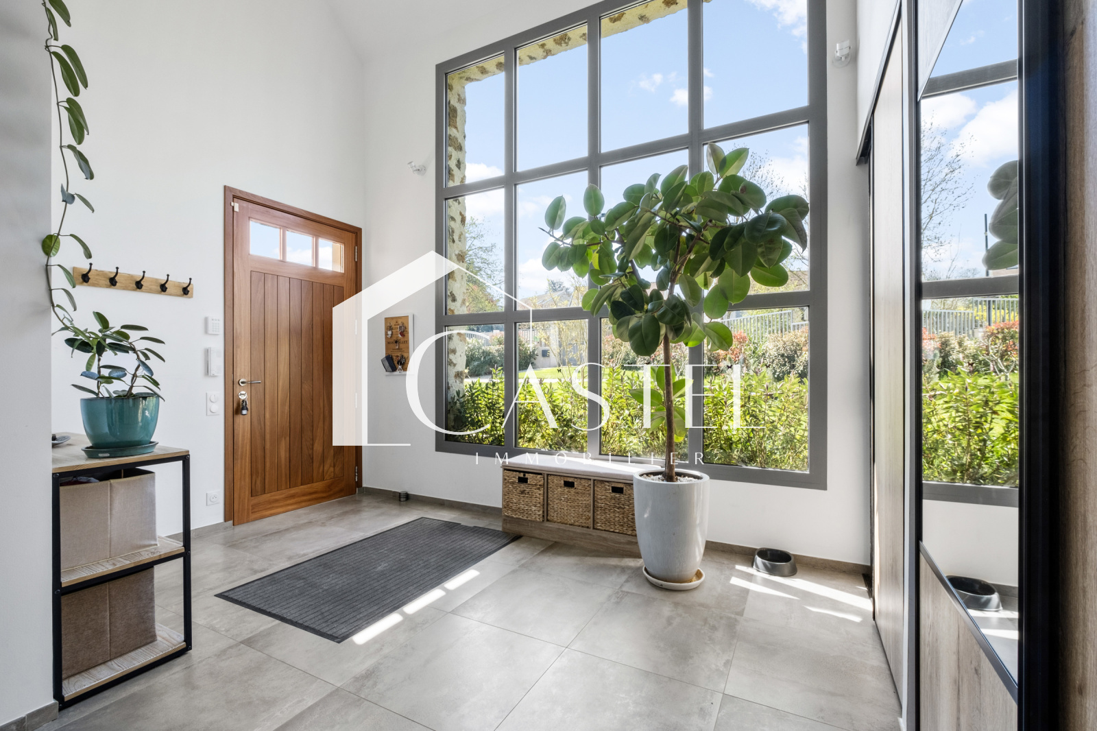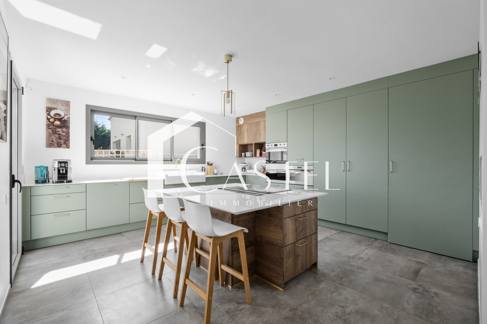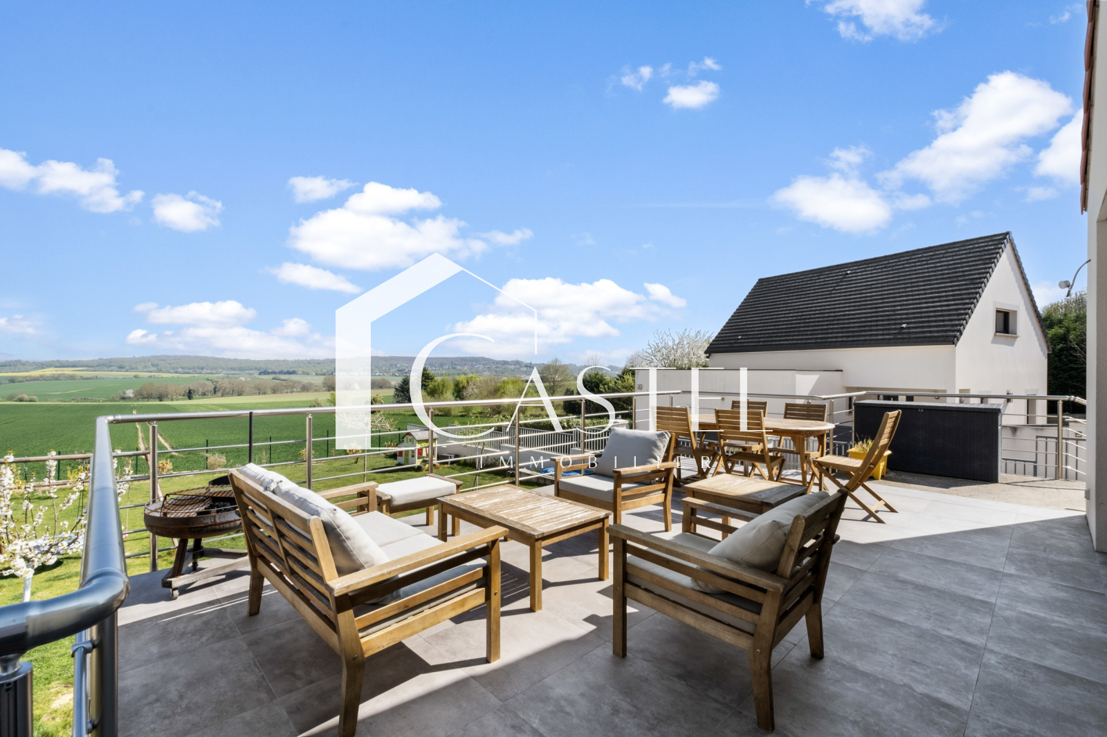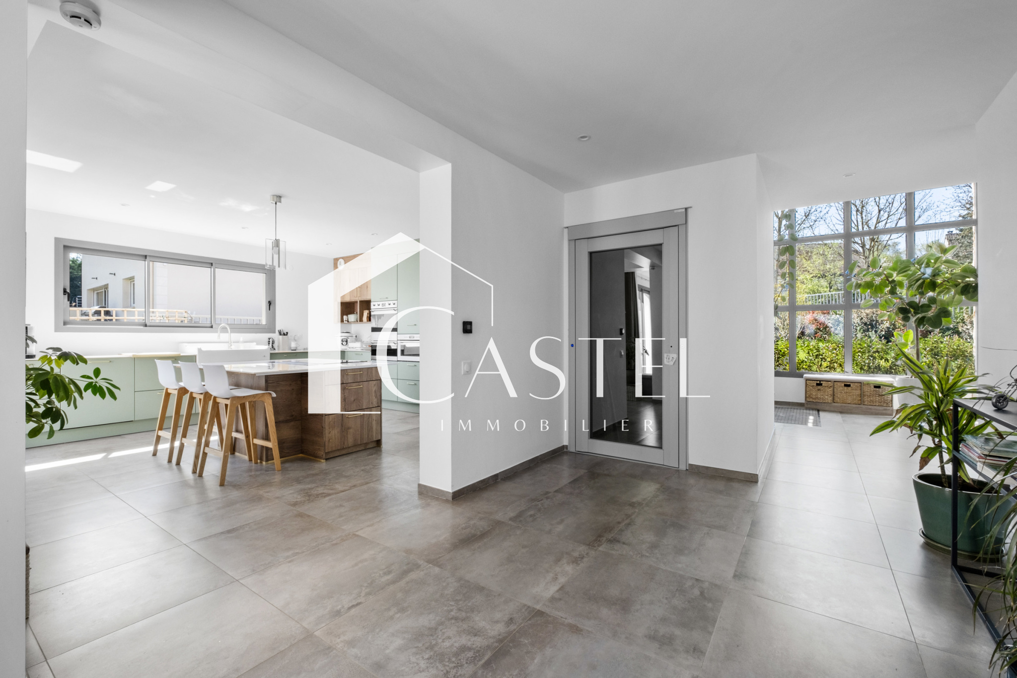 Orgeval (78630)Belle maison d'architecte de 267m² à la décoration soignée et des prestations de qualité. La maison propose des pièces spacieuses dont 5 chambres et bénéficie des normes PMR et un ascenseur afin de pouvoir profiter pleinement de l'ensemble. Elle se compose au rez-de-chaussée, d'une entrée cathédrale avec rangements, d'une lumineuse pièce de vie de 46 m² avec sa cuisine ouverte équipée de 18 m² et ses larges baies vitrées donnant sur des terrasses et offrant une vue dégagée sur la vallée, d'un cellier, d'un bureau aménagé, d'une suite parentale avec un dressing et une salle de bains, toilettes. A l'étage, se trouve une mezzanine, une chambre avec dressing et salle d'eau, 2 autres chambres, une salle de bains, toilettes. L'ensemble est complété par un sous sol pouvant accueillir 2/3 véhicules, une cave à vin, une salle de billard, un local technique. Normes RT2012 équipée d'une pompe à chaleur, de panneaux solaires et d'un poêle à bois. Terrain clos et arboré de 1 000 m². Bus pour les écoles à proximité, écoles maternelle et primaire à 600 mètres de la maison.