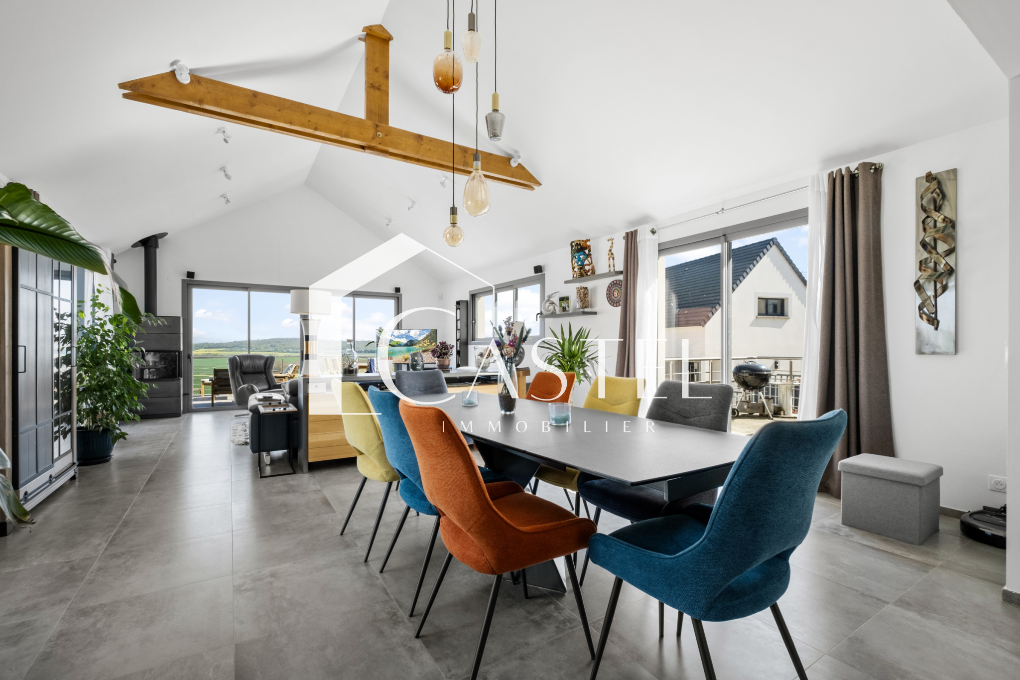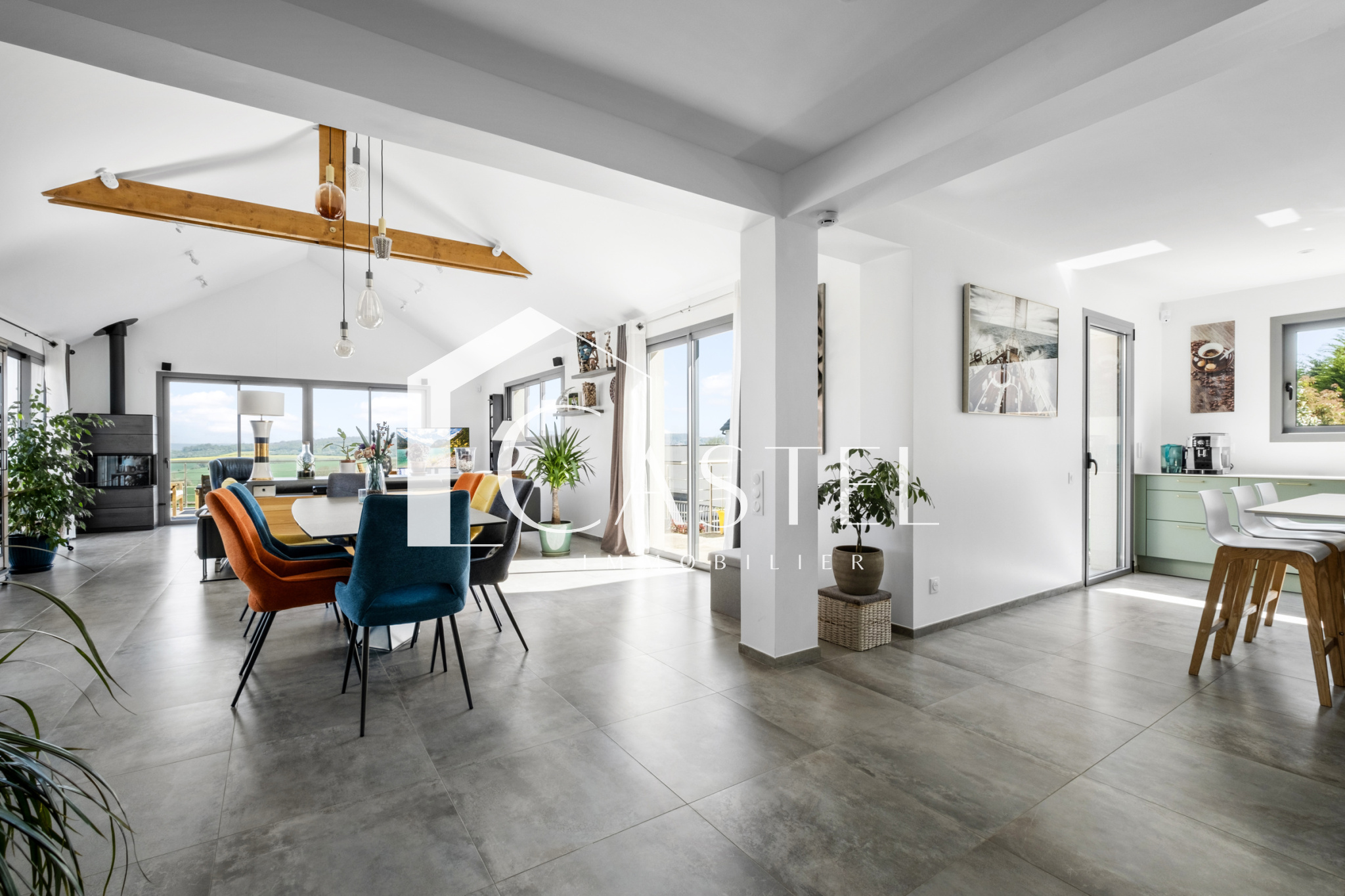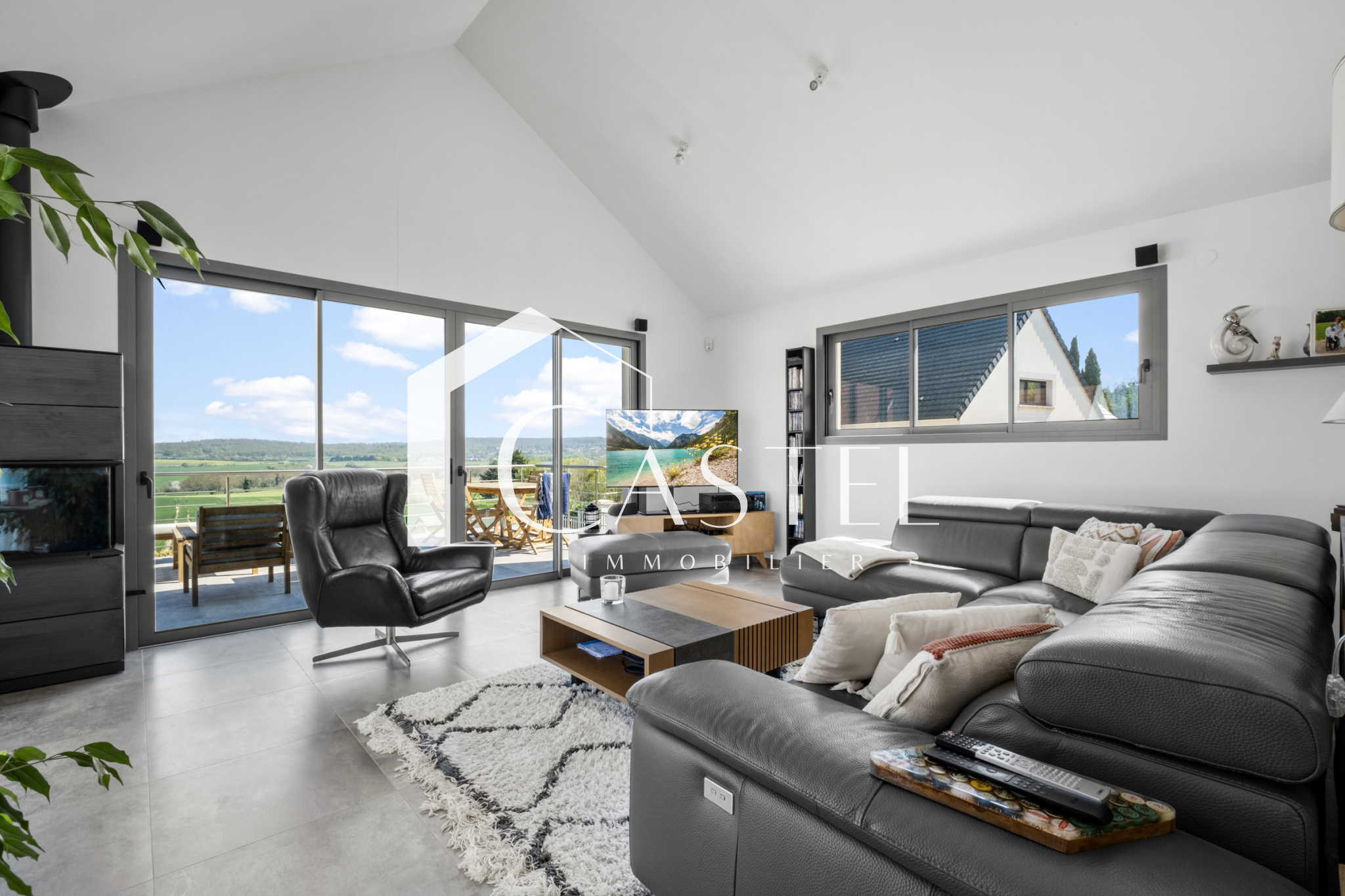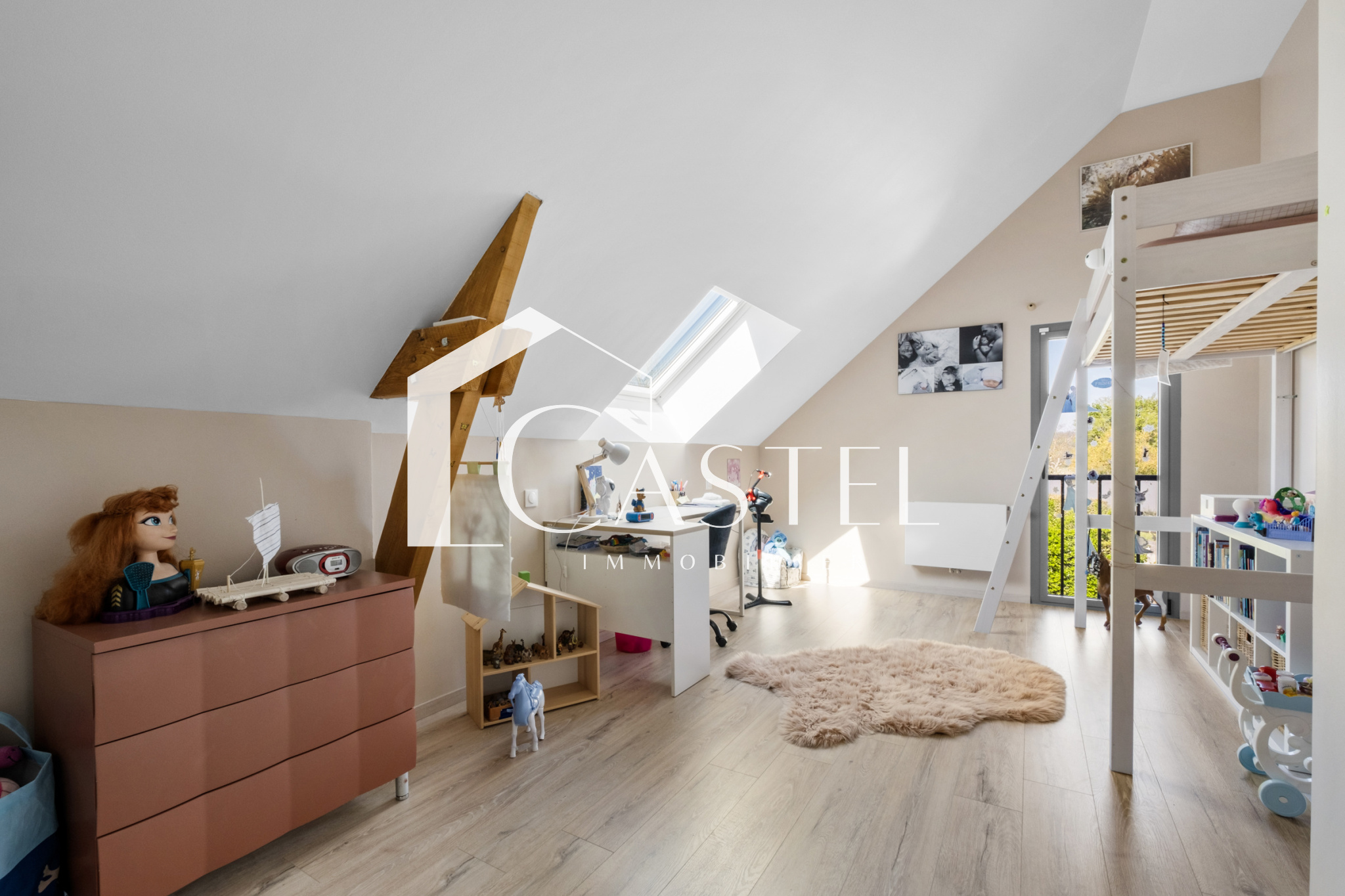Orgeval (78630)Belle maison d'architecte de 267m² à la décoration soignée et des prestations de qualité. La maison propose des pièces spacieuses dont 5 chambres et bénéficie des normes PMR et un ascenseur afin de pouvoir profiter pleinement de l'ensemble. Elle se compose au rez-de-chaussée, d'une entrée cathédrale avec rangements, d'une lumineuse pièce de vie de 46 m² avec sa cuisine ouverte équipée de 18 m² et ses larges baies vitrées donnant sur des terrasses et offrant une vue dégagée sur la vallée, d'un cellier, d'un bureau aménagé, d'une suite parentale avec un dressing et une salle de bains, toilettes. A l'étage, se trouve une mezzanine, une chambre avec dressing et salle d'eau, 2 autres chambres, une salle de bains, toilettes. L'ensemble est complété par un sous sol pouvant accueillir 2/3 véhicules, une cave à vin, une salle de billard, un local technique. Normes RT2012 équipée d'une pompe à chaleur, de panneaux solaires et d'un poêle à bois. Terrain clos et arboré de 1 000 m². Bus pour les écoles à proximité, écoles maternelle et primaire à 600 mètres de la maison.
