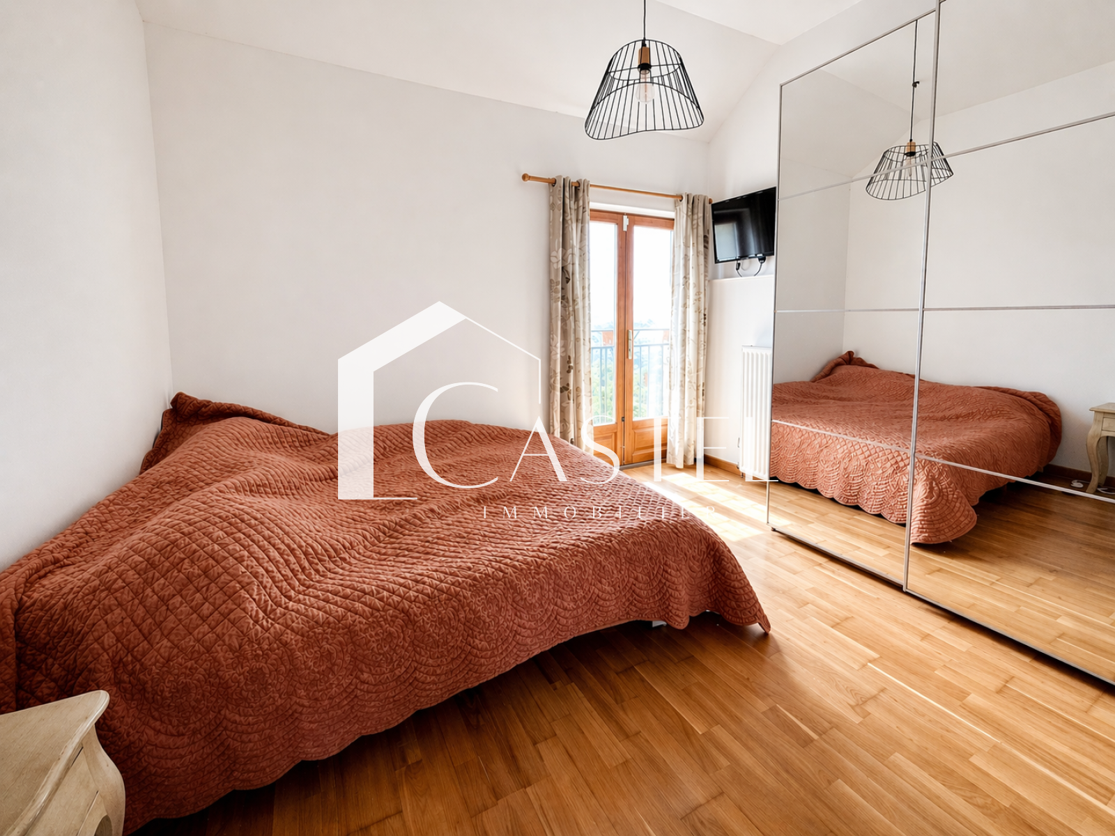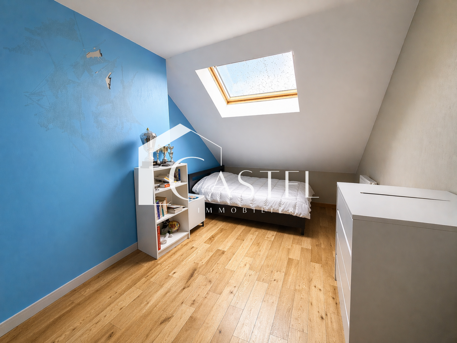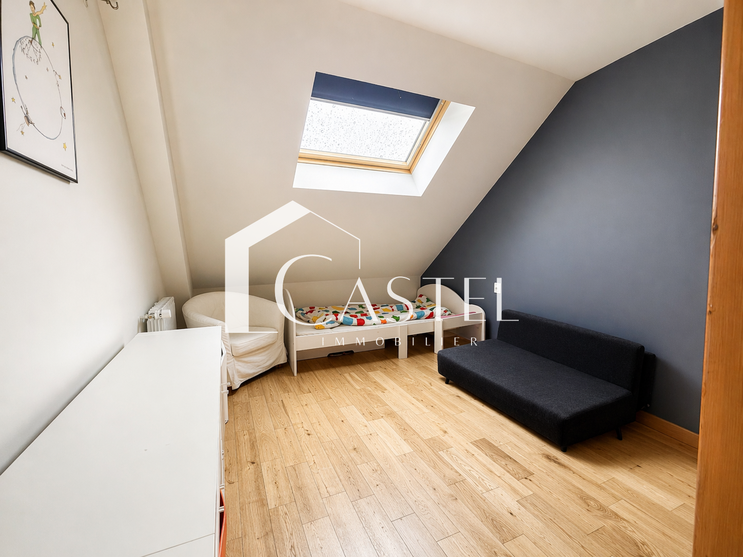 À l’étage supérieur, un palier dessert une première chambre avec rangements. Le dernier niveau offre un espace jeux ainsi que deux chambres mansardées, accompagnées d’une salle de bains et d’un second WC.