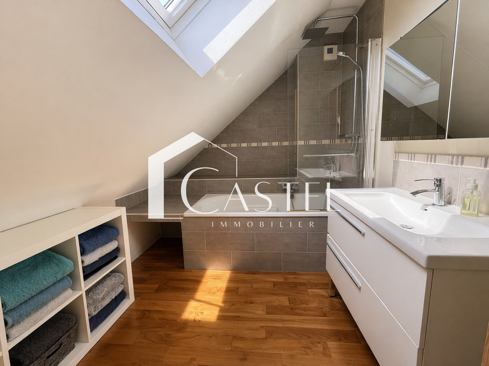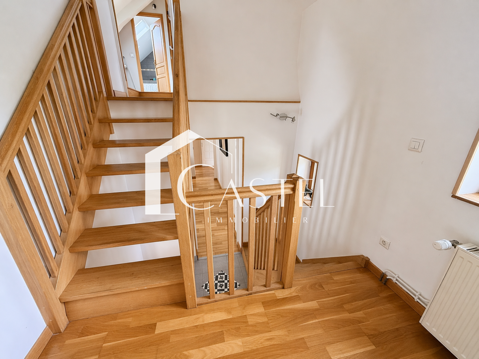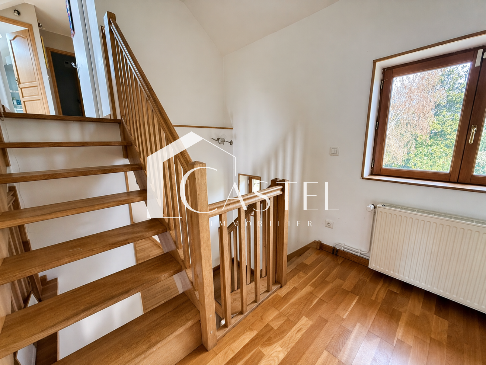 À l’étage supérieur, un palier dessert une première chambre avec rangements. Le dernier niveau offre un espace jeux ainsi que deux chambres mansardées, accompagnées d’une salle de bains et d’un second WC.
