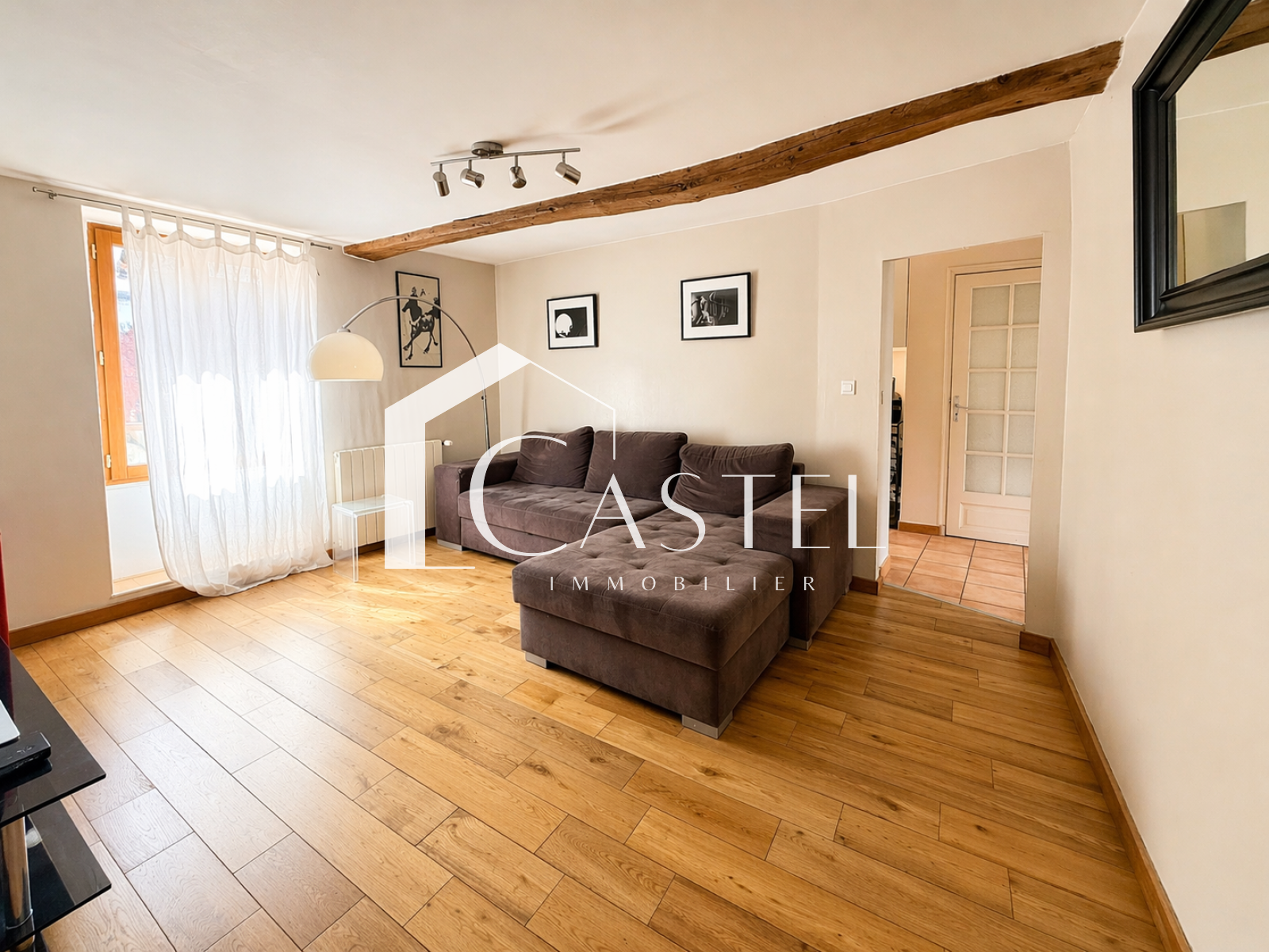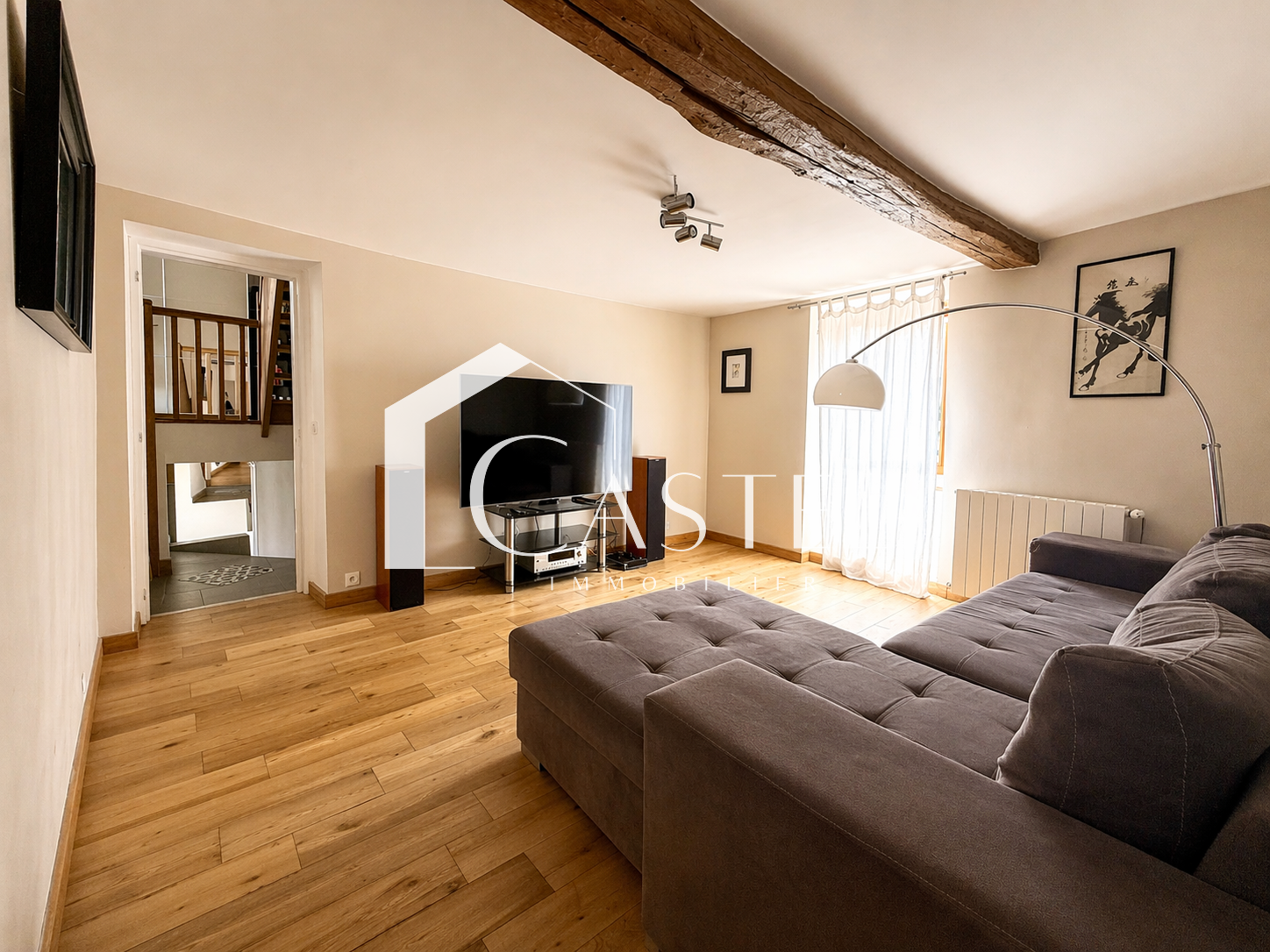 Le 1er étage s’organise autour d’un salon chaleureux de 16 m², exposé sud-ouest, avec poutres apparentes et parquet massif. Le conduit de cheminée existant permet l’installation d’un futur poêle ou insert. Ce niveau propose également une cuisine aménagée et équipée de 9 m², une salle à manger lumineuse de 20 m² avec accès extérieur, une petite salle d’eau ainsi qu’un WC.