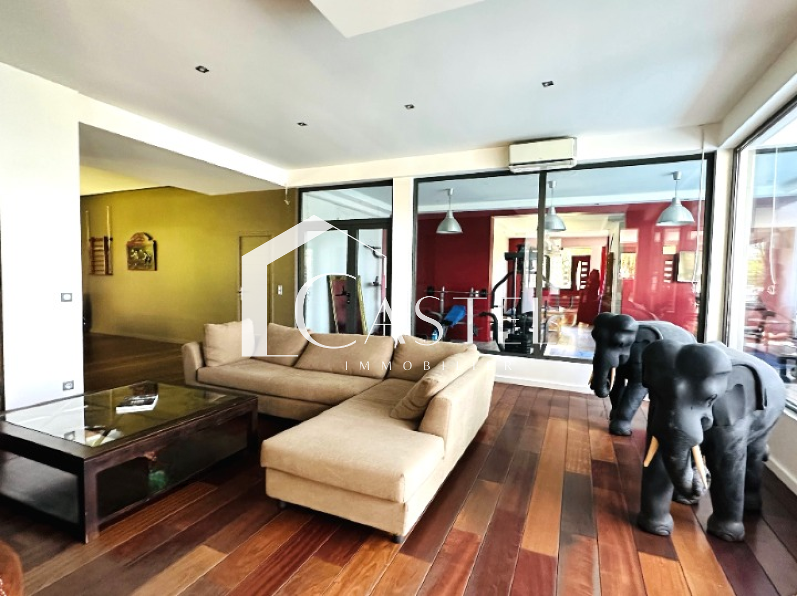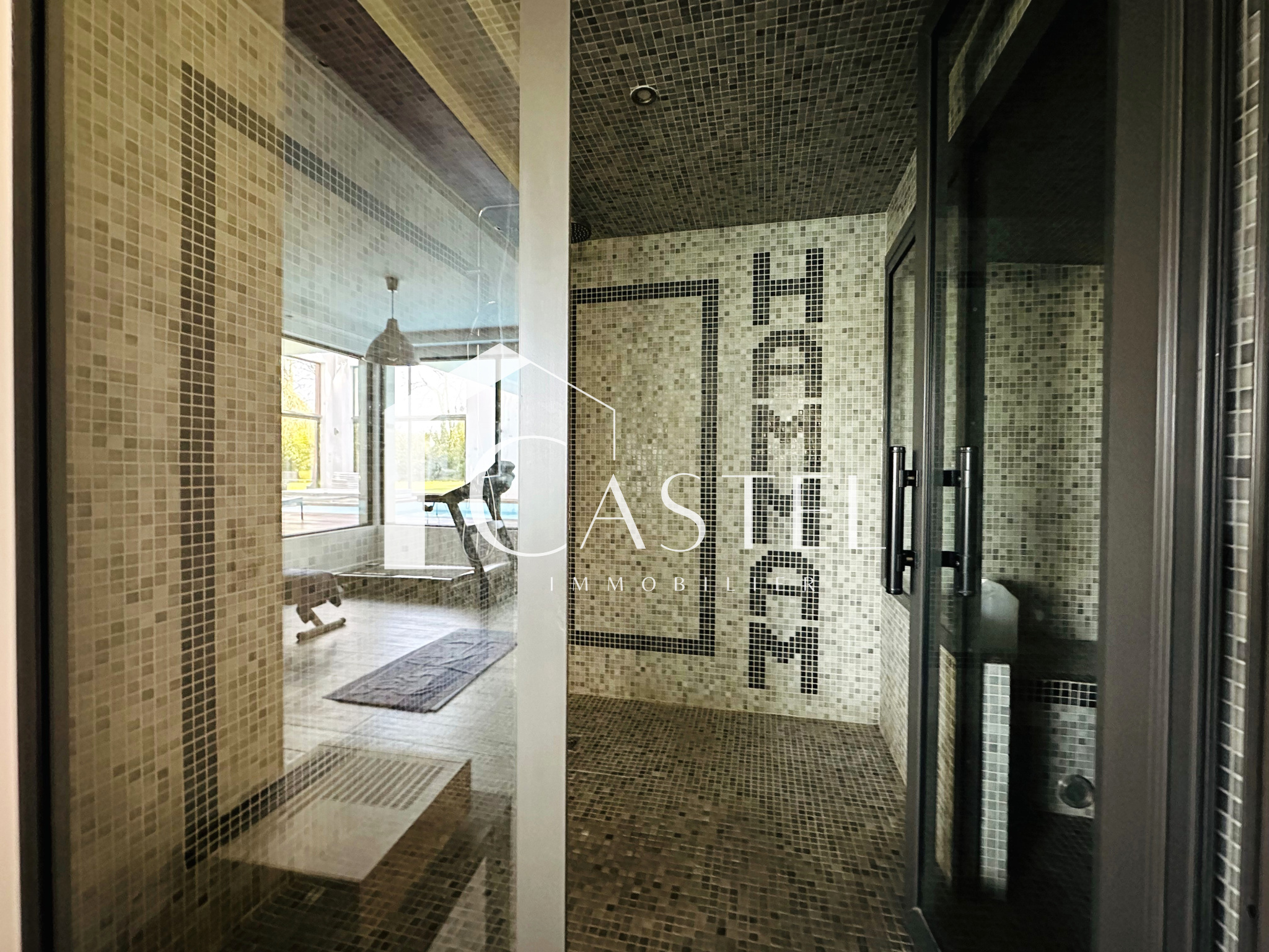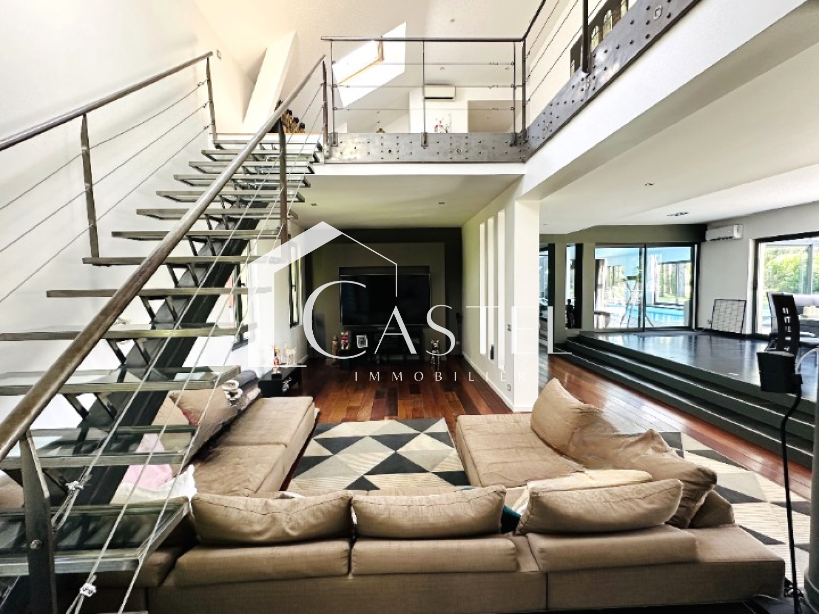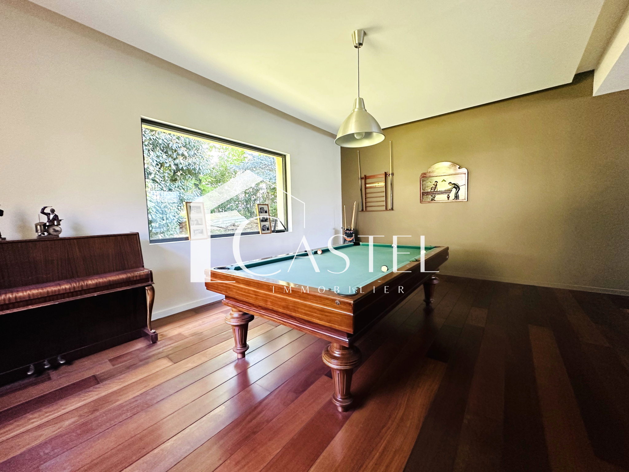 La propriété principale de 900 m² se compose d’une spacieuse réception de plain pied d'environ 150m² ouverte sur le jardin par de larges baies vitrées, d'une cuisine entièrement équipée donnant sur le salon et la salle à manger. Une pièce pouvant être aménagée en chambre avec accès indépendant. Ce niveau est complété par des équipements de loisirs dont un salon billard, une piscine intérieure (11 X 4m) chauffée avec nage à contre-courant, un jacuzzi, une salle de sport avec hammam et douches et deux wc invités.