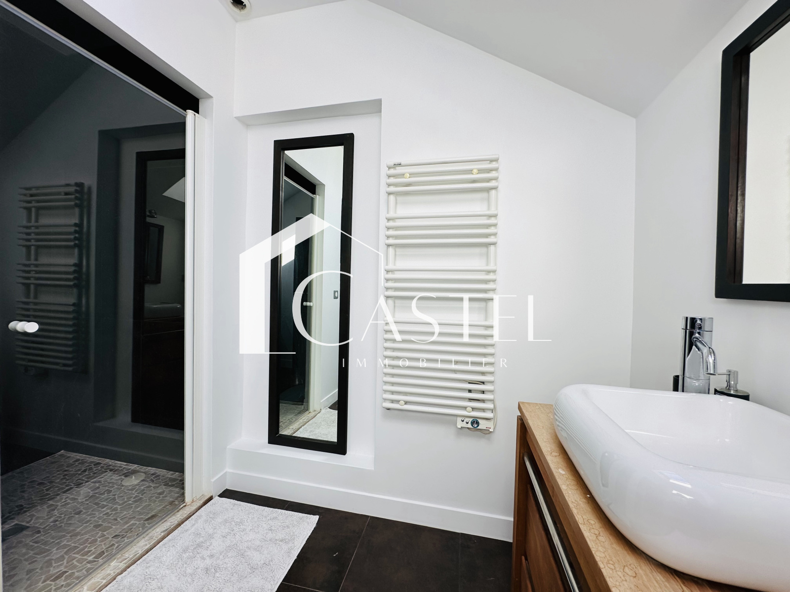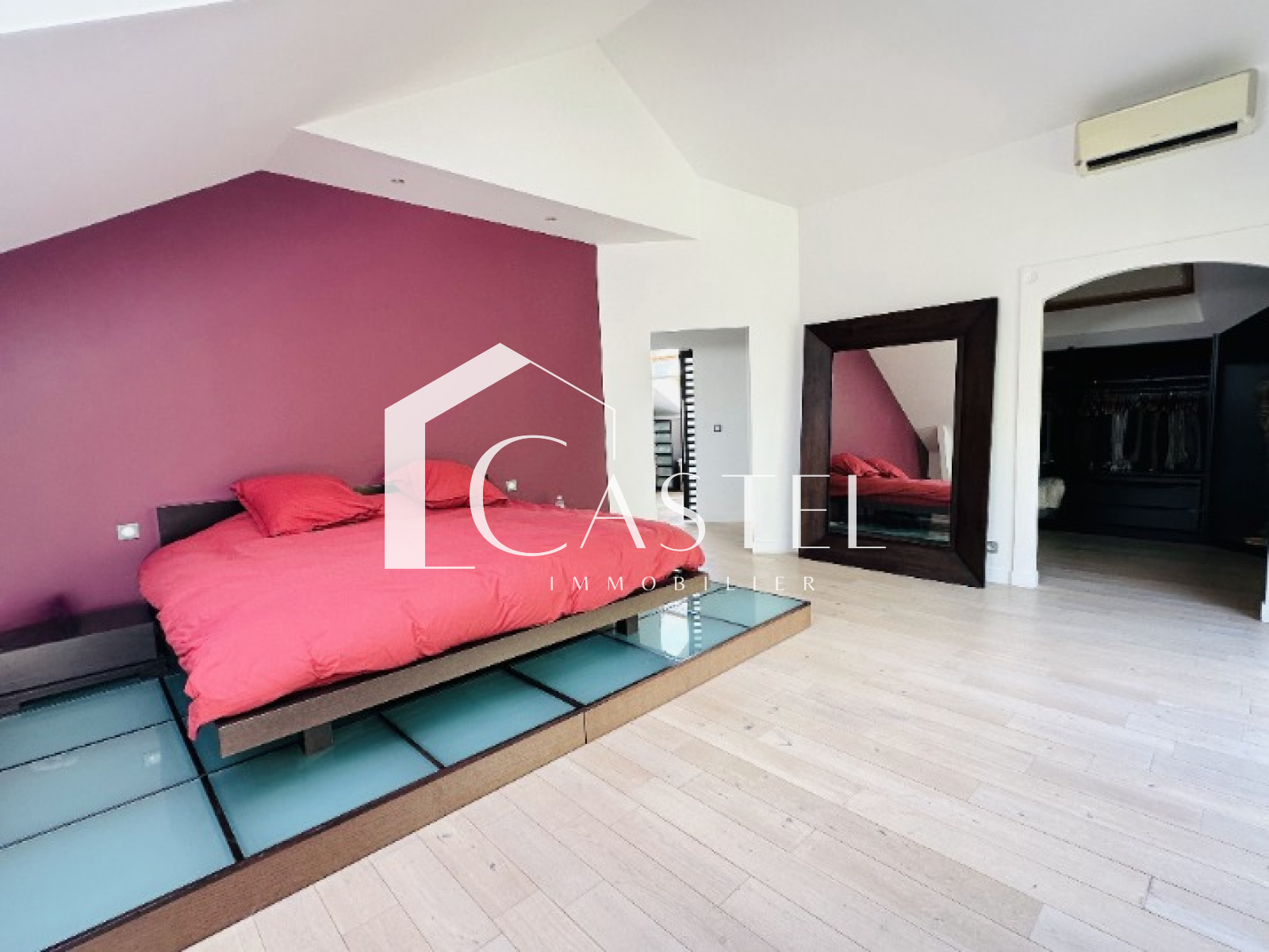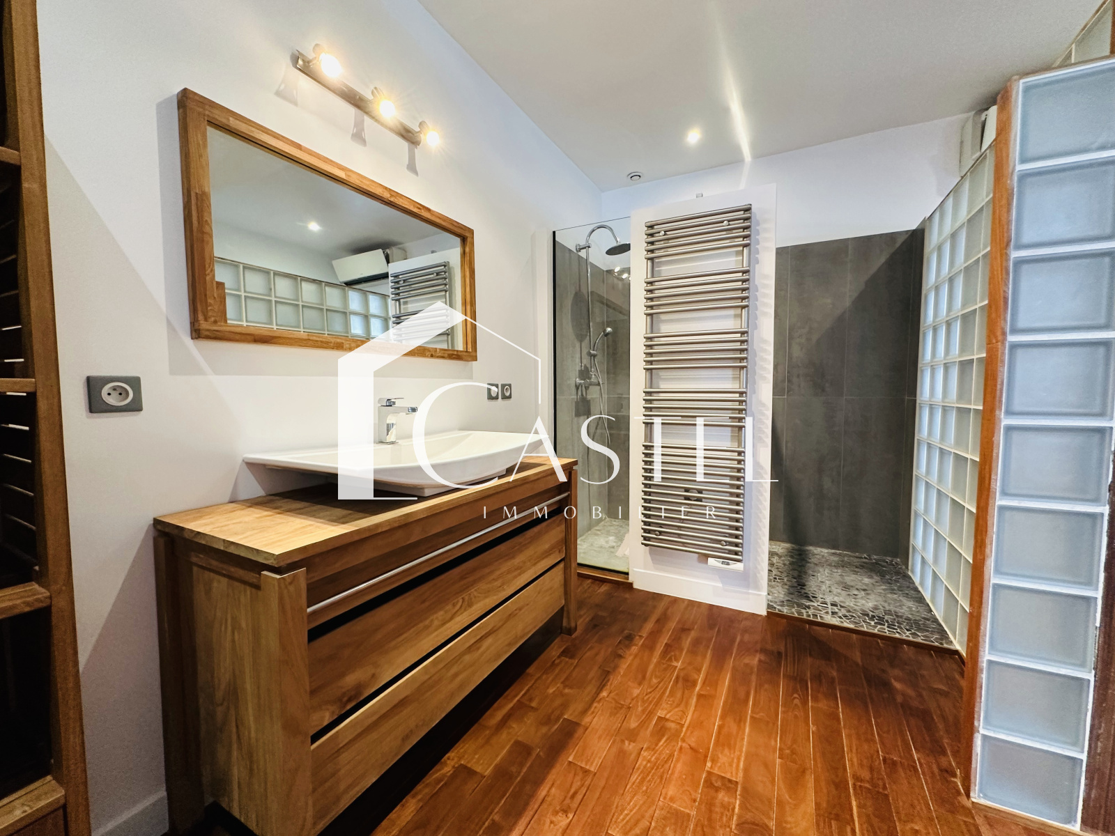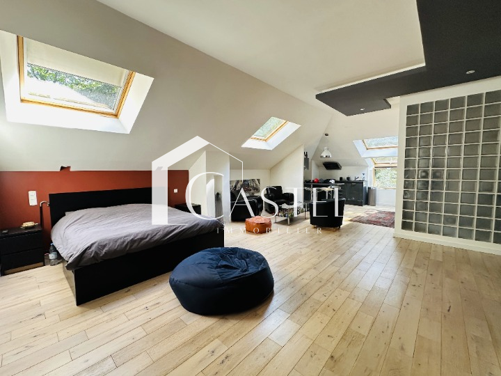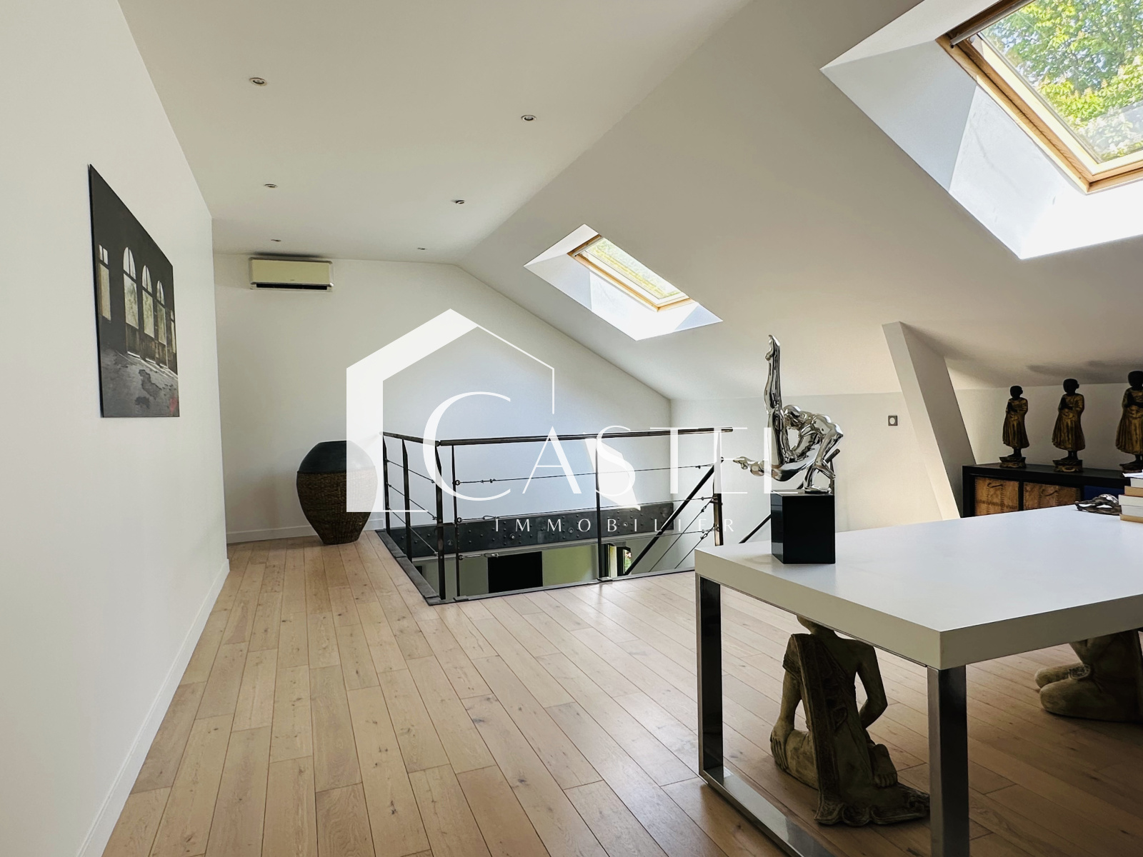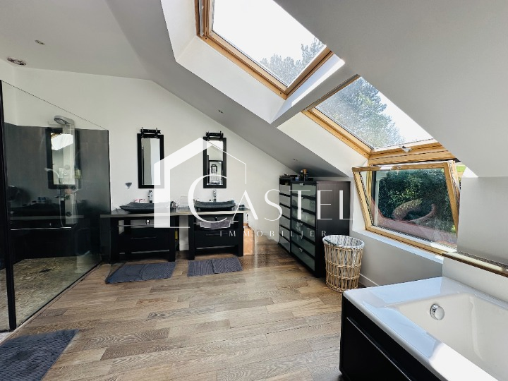 A l'étage, un grand dégagement avec coin bureau dessert trois suites indépendantes avec chacune douches / bains, wc et dressing, une buanderie. Un appartement avec accès indépendant (depuis le RdC) composé d’une grande pièce à vivre, d'une cuisine ouverte équipée et d'une salle de douches avec wc. Une vaste pièce de 100 m² reste à aménager à la convenance des futurs acquéreurs.