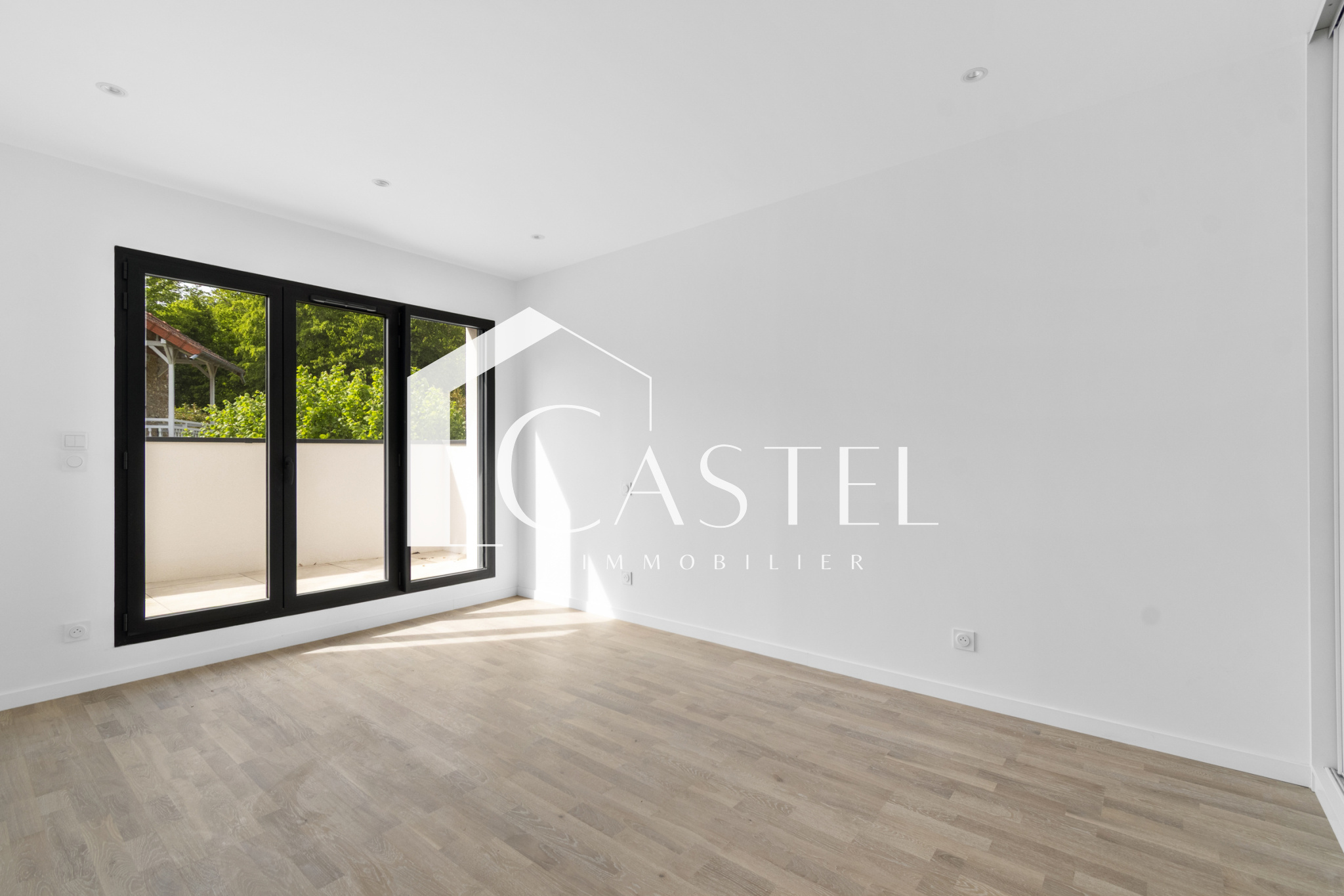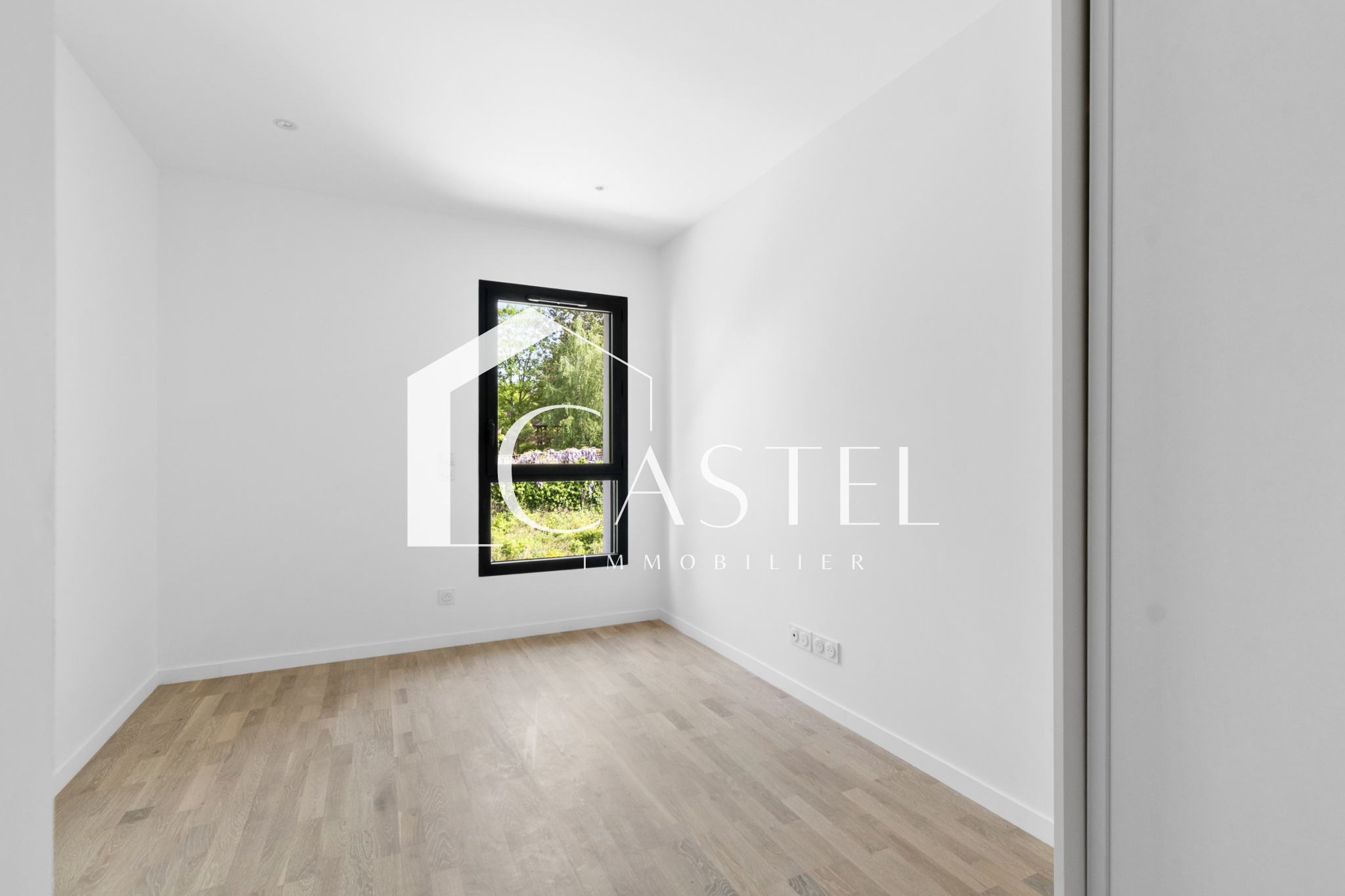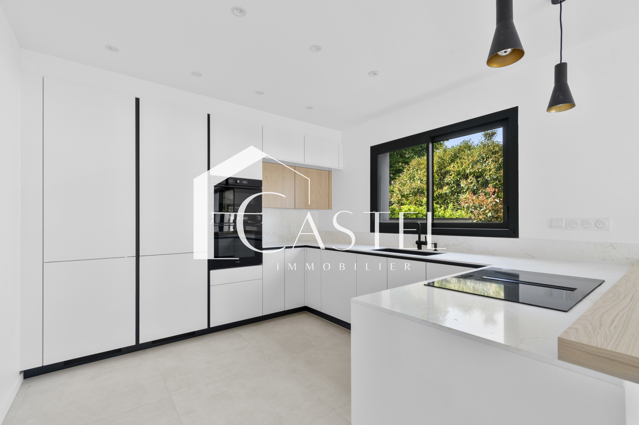 Une terrasse sans vis à vis donnant sur le jardin paysager. Carport et stationnements extérieurs. Prestations de qualité (climatisation, domotique, volets électriques).