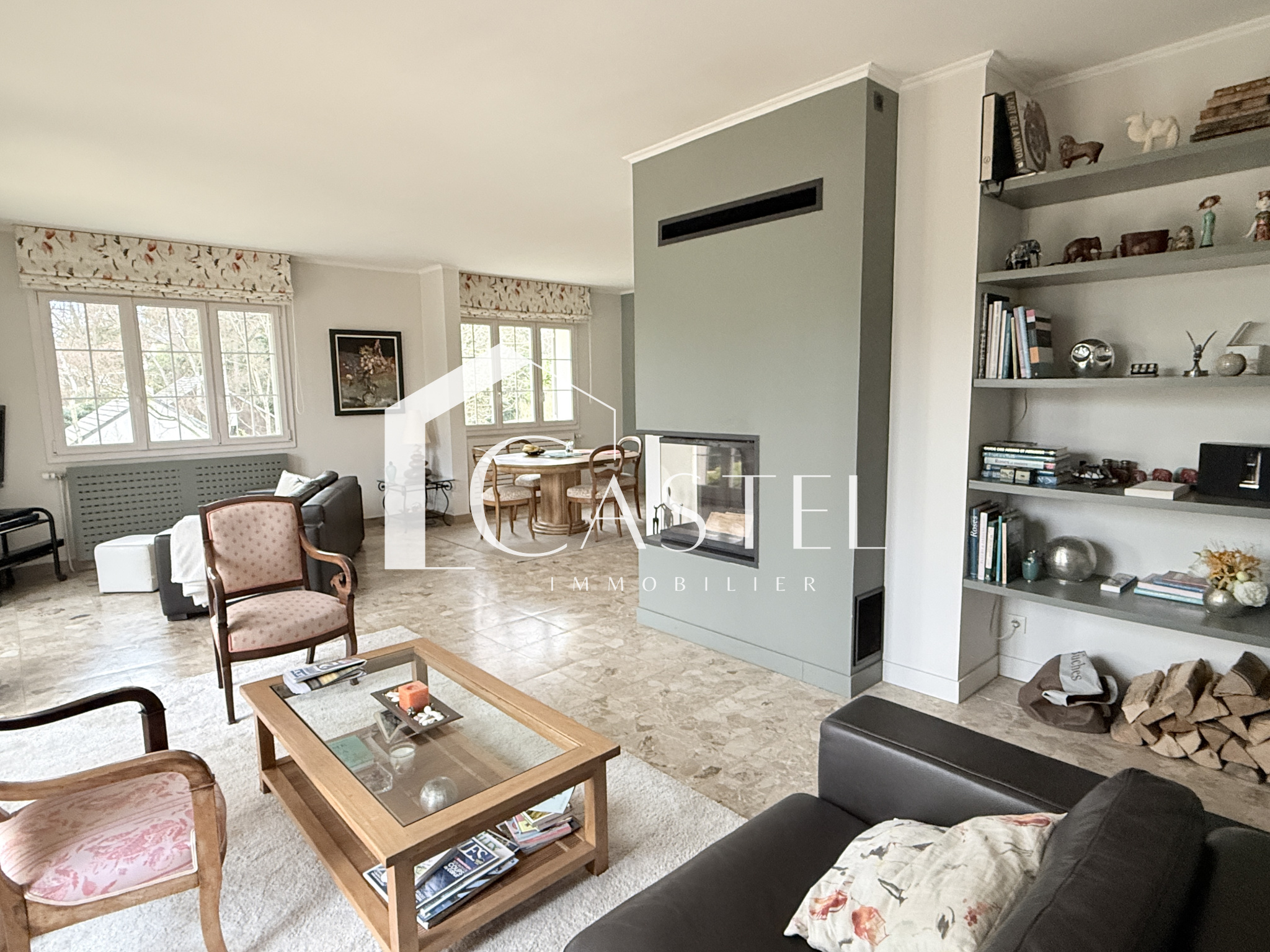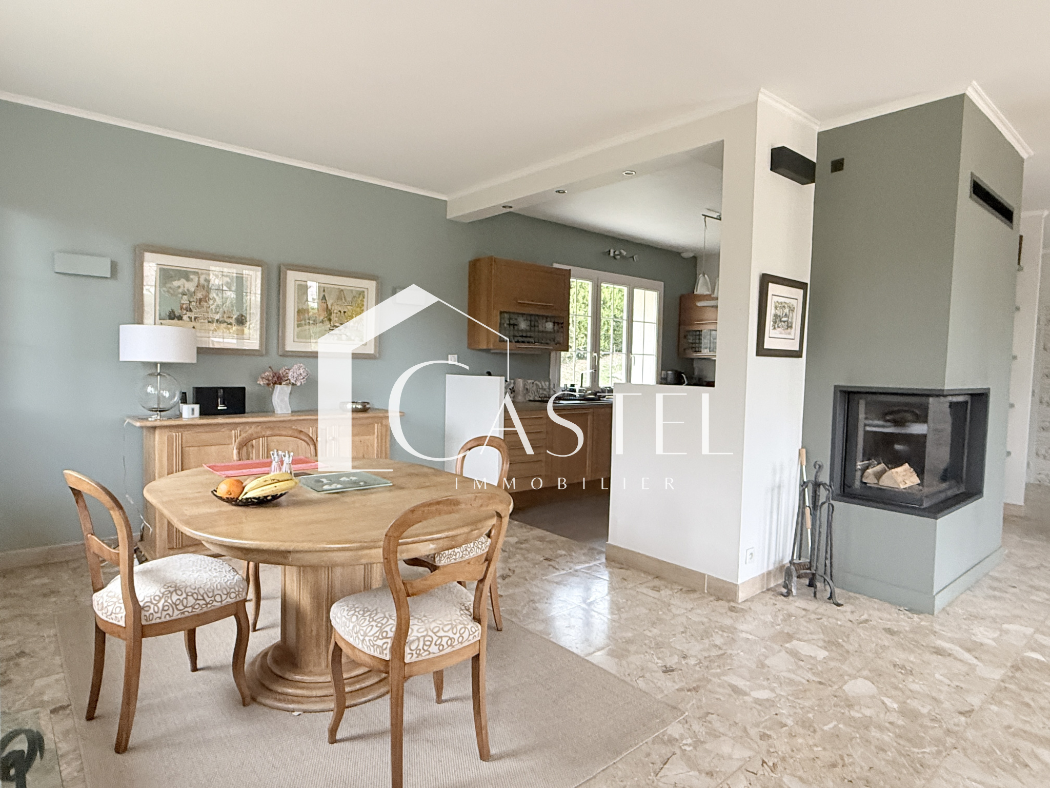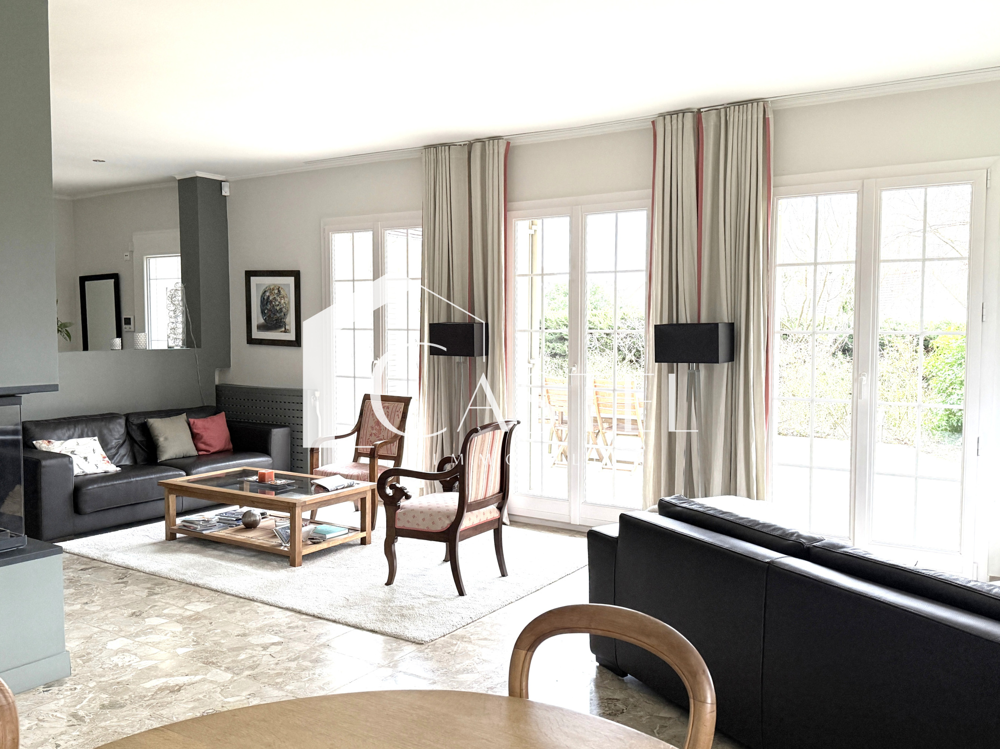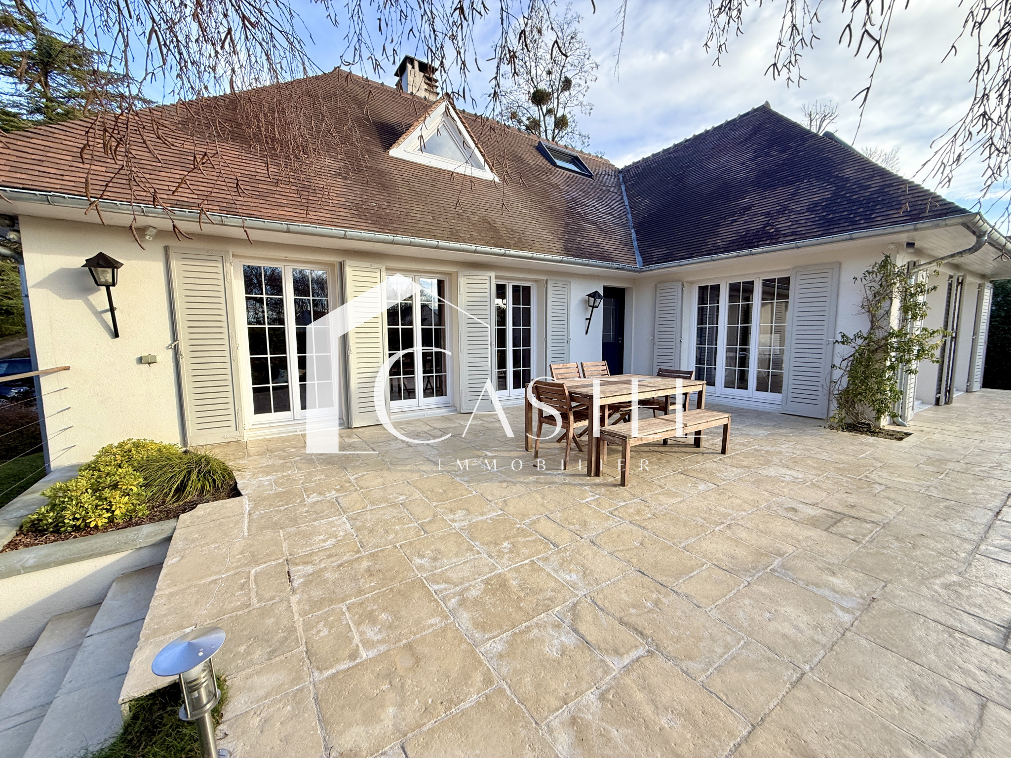 Orgeval (78630)Dans un écrin de verdure, venez découvrir cette belle maison familiale d'environ 225 m2 entièrement rénovée avec soin sur un terrain de 1200 m2. Elle offre au rez de chaussée : une entrée, un séjour/ salle à manger très lumineux qui s'ouvre sur une grande terrasse exposée plein sud et sans vis à vis, une cuisine équipée ouverte sur la salle à manger. Toujours au rez-de-chaussée, la partie nuit propose 3 chambres (dont une avec un dressing), une salle de bains (avec douche, baignoire et wc) et un wc indépendant. A l'étage,un grand palier lumineux pouvant accueillir un coin bureau dessert 2 grandes chambres ayant chacune une salle d'eau avec wc. Au sous-sol, vous disposez d'une buanderie et d'une grande pièce de 38 m² pouvant servir de salle de sport, bureau, salle de cinéma.... Parkings en extérieur.