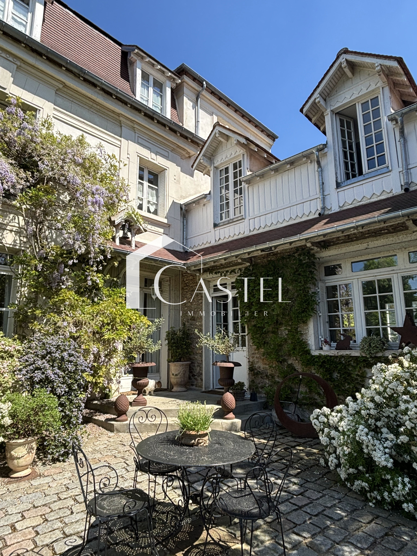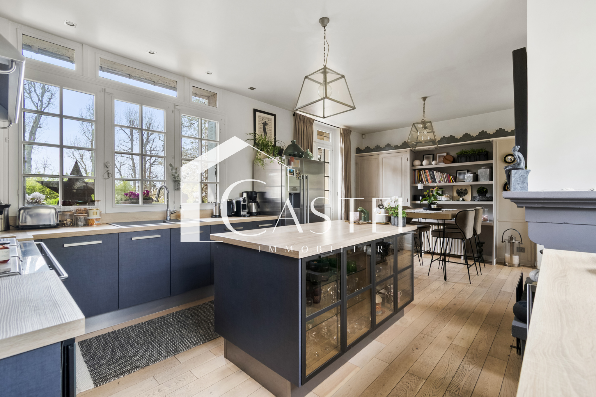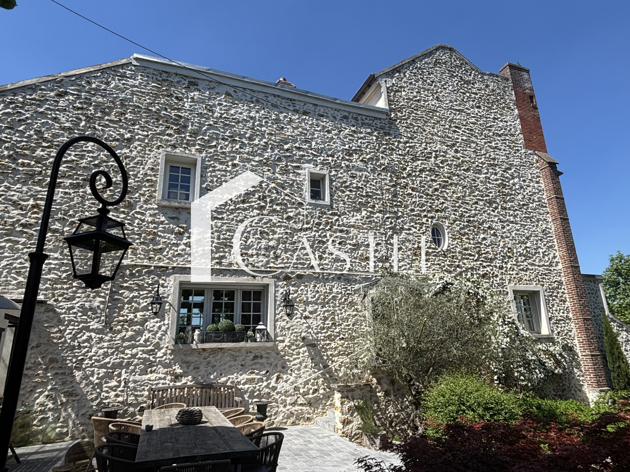 Orgeval (78630)A Orgeval, élégante maison de maître de la fin du XIXe siècle au charme fou, ses volumes, sa luminosité et sa rénovation de qualité aux prestations soignées et avec goût. Elle bénéficie d'un magnifique jardin arboré, agrémenté de vues dégagées sur la campagne environnante. Elle vous propose 280 m² habitables (hors sous-sol). Elle comprend : Au rez-de-chaussée, Belle entrée avec carreaux de ciment anciens, salon lumineux avec cheminée, ouvert sur terrasse et balcon par de nombreuses portes vitrées (3,25m de hateur sous plafond), salle à manger, cuisine ouverte haut de gamme Gaggenau avec espace dînatoire et cheminée fonctionnelle, buanderie attenante avec rangements sur mesure, toilettes invités.
