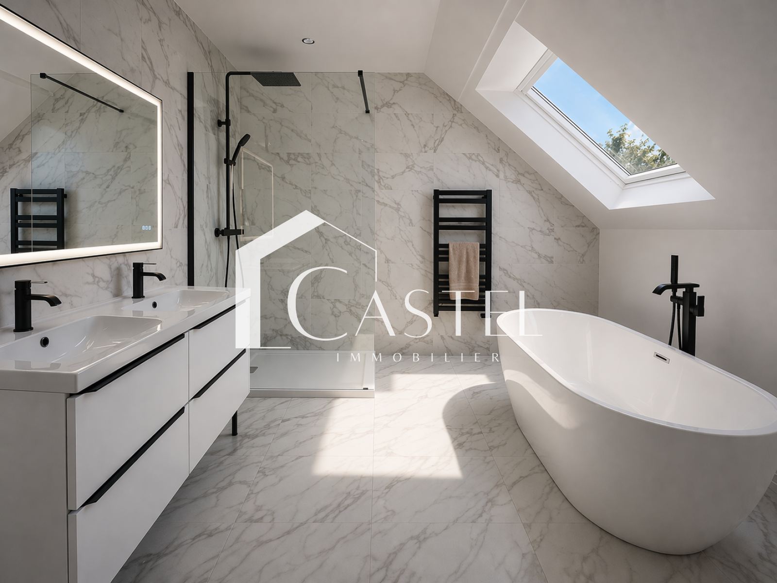 Le deuxième étage accueille principalement l’espace parental avec une suite disposant de sa pièce d’eau privative avec douche, baignoire balnéo, double vasque et WC. Une 8e chambre complète ce niveau.