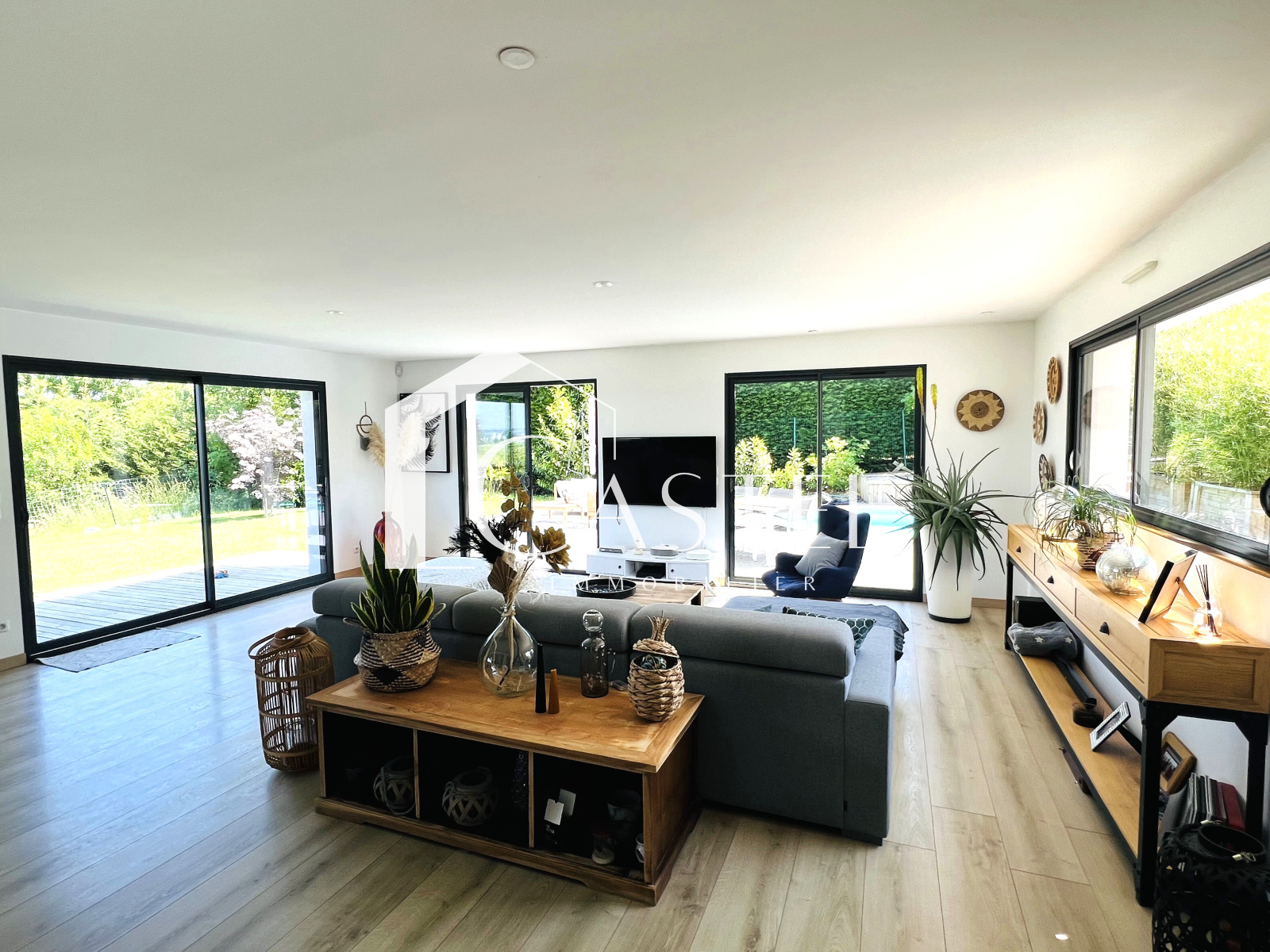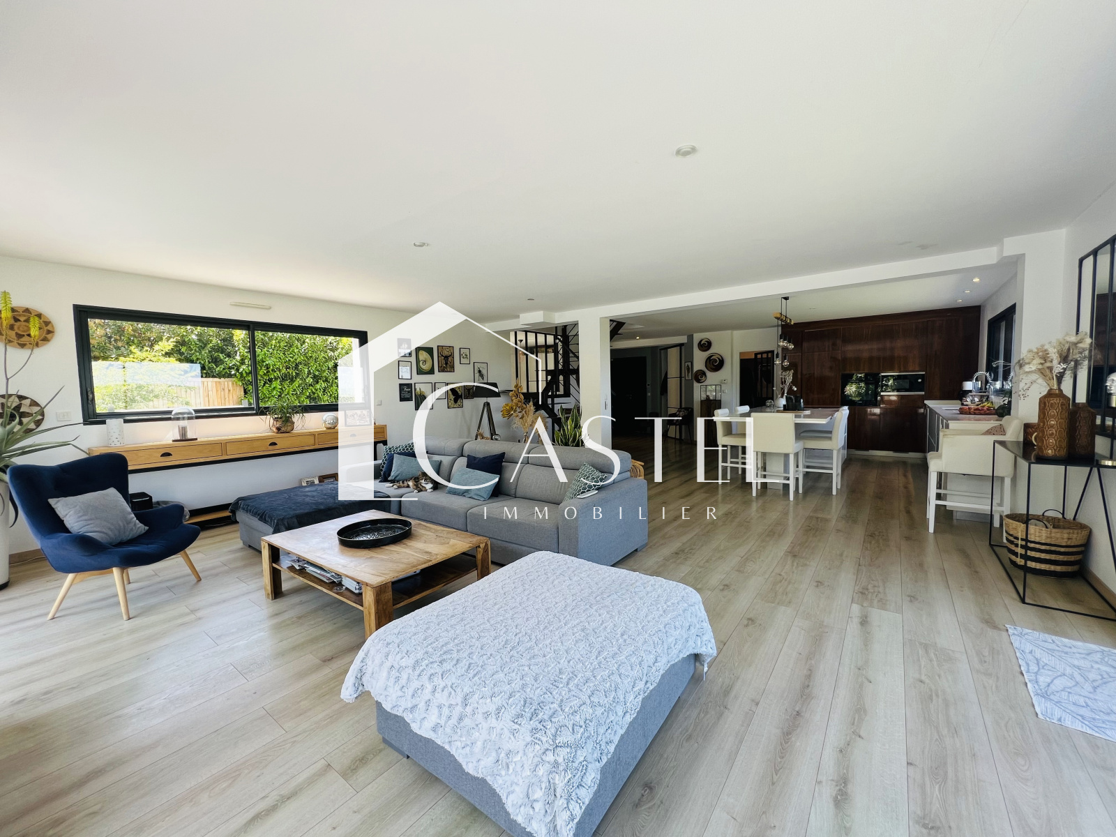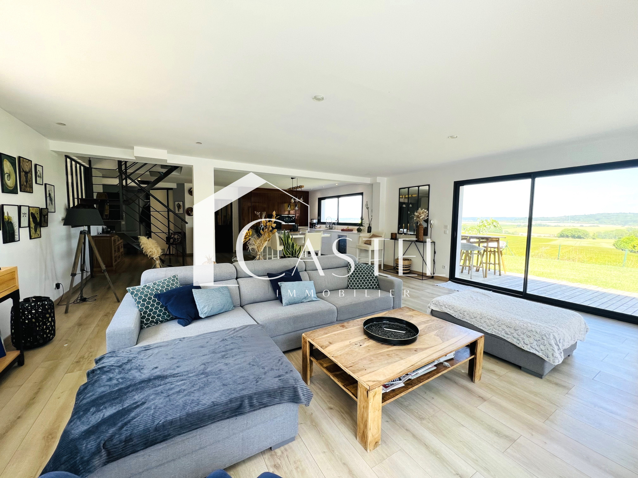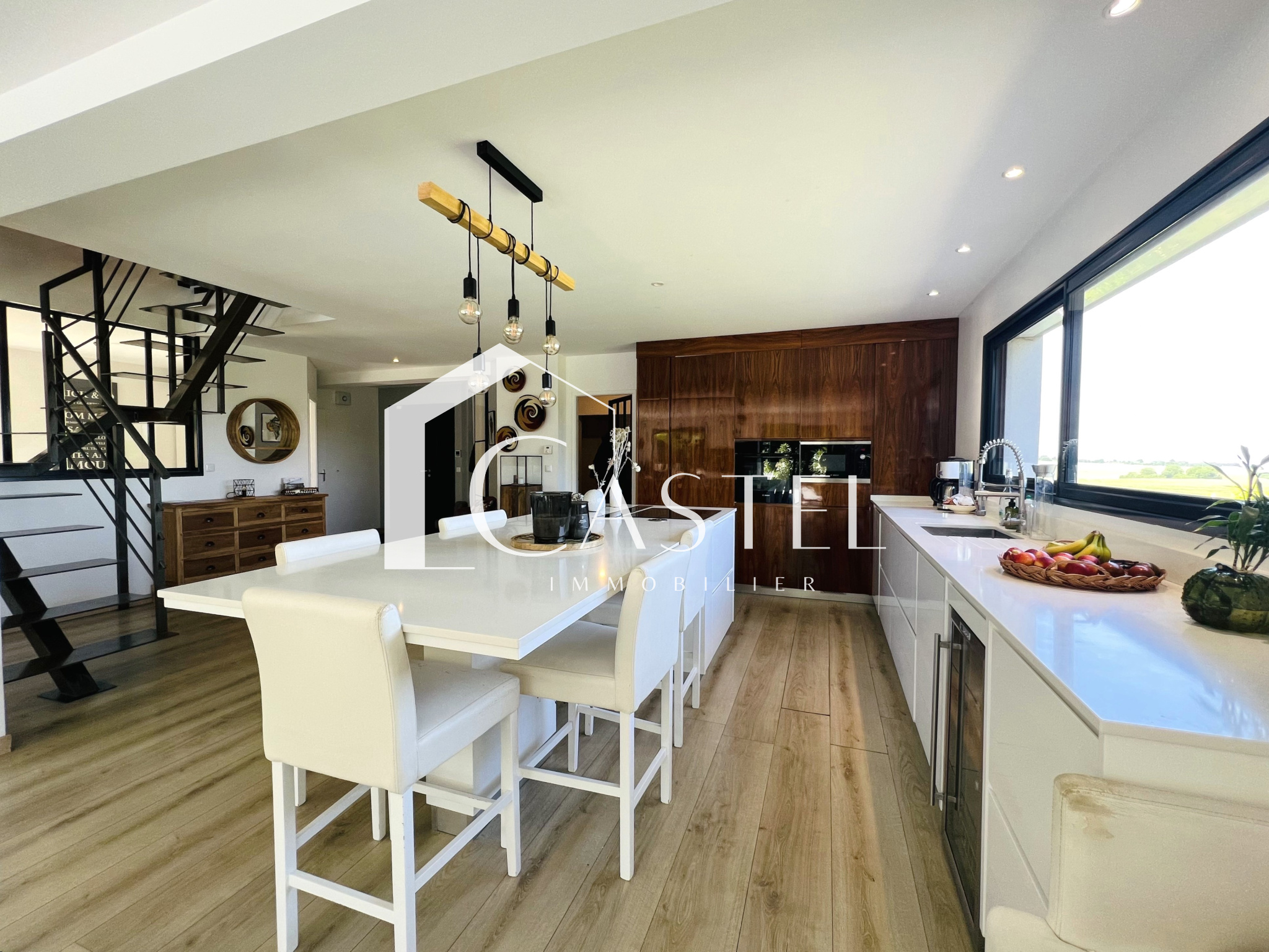 Dès que vous franchirez la porte, vous serez accueilli par une vaste pièce à vivre avec une grande cuisine ouverte baignée de lumière naturelle, créant ainsi une atmosphère chaleureuse et conviviale, une buanderie, un bureau et un wc completent également le rez-de-chaussée.