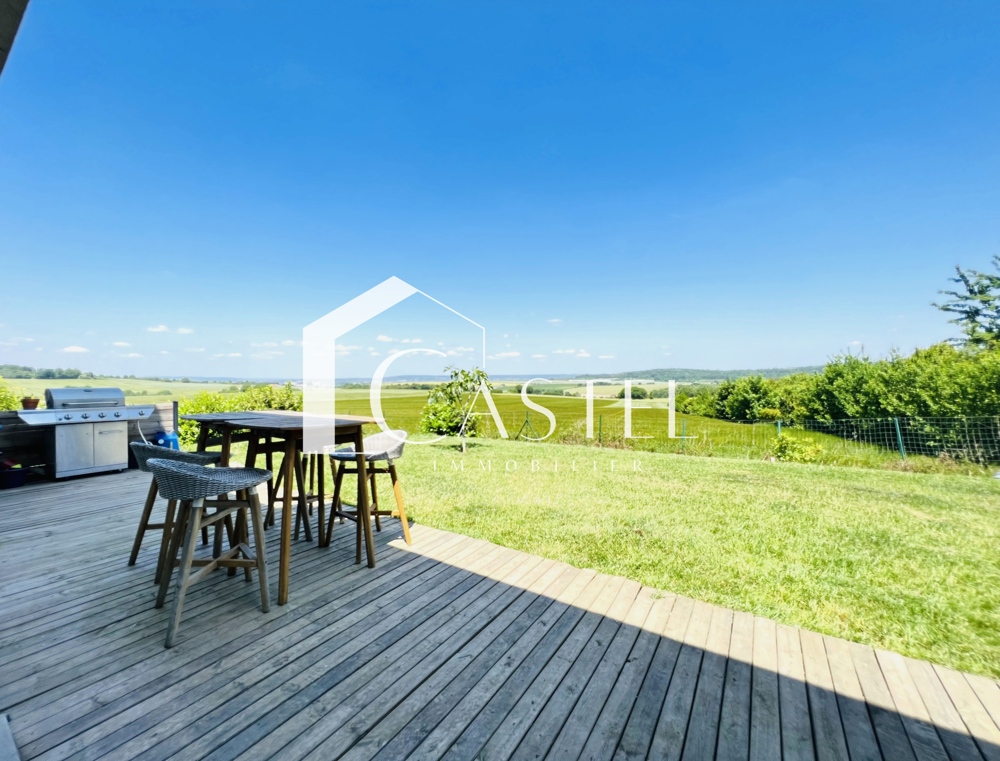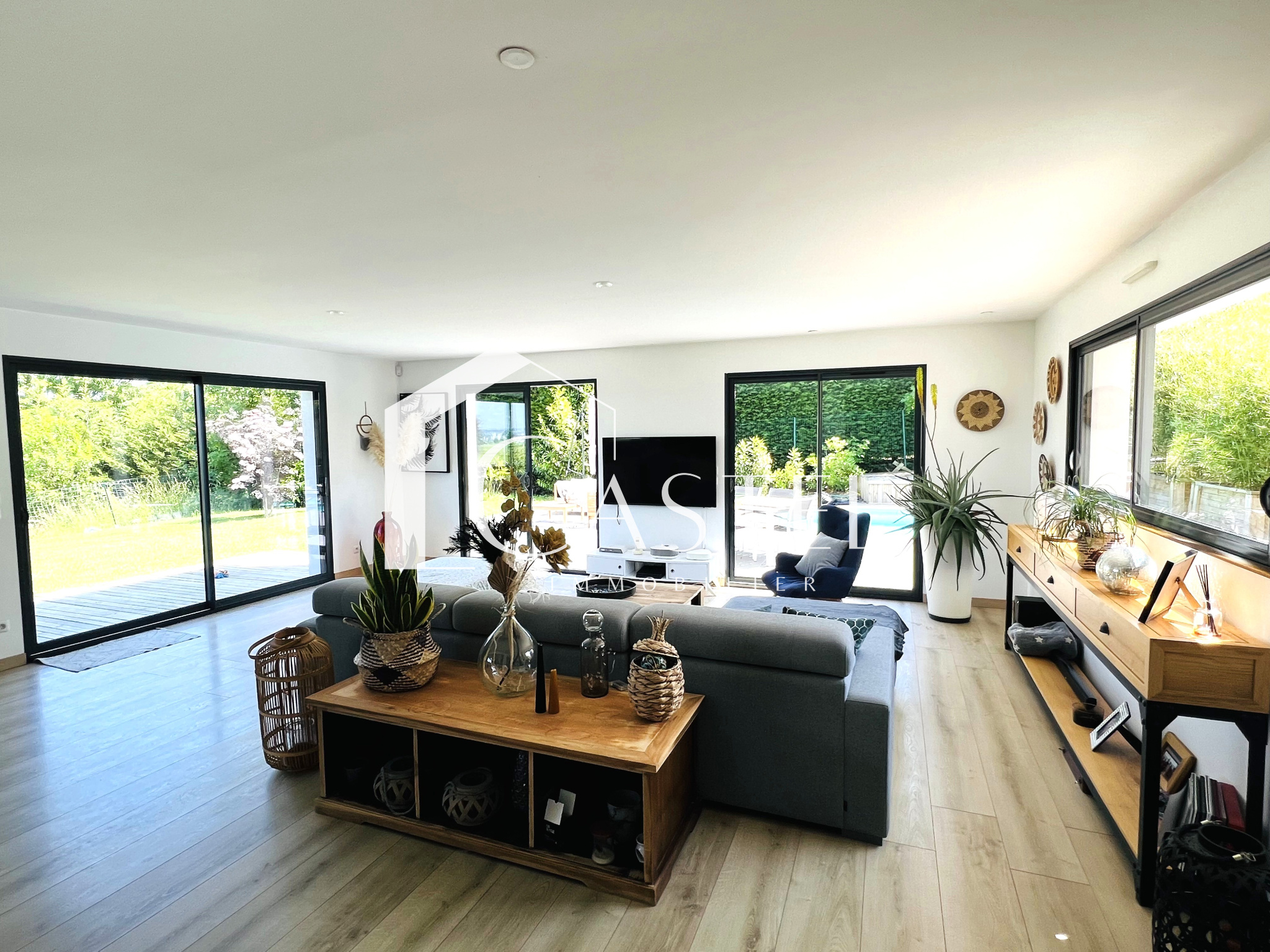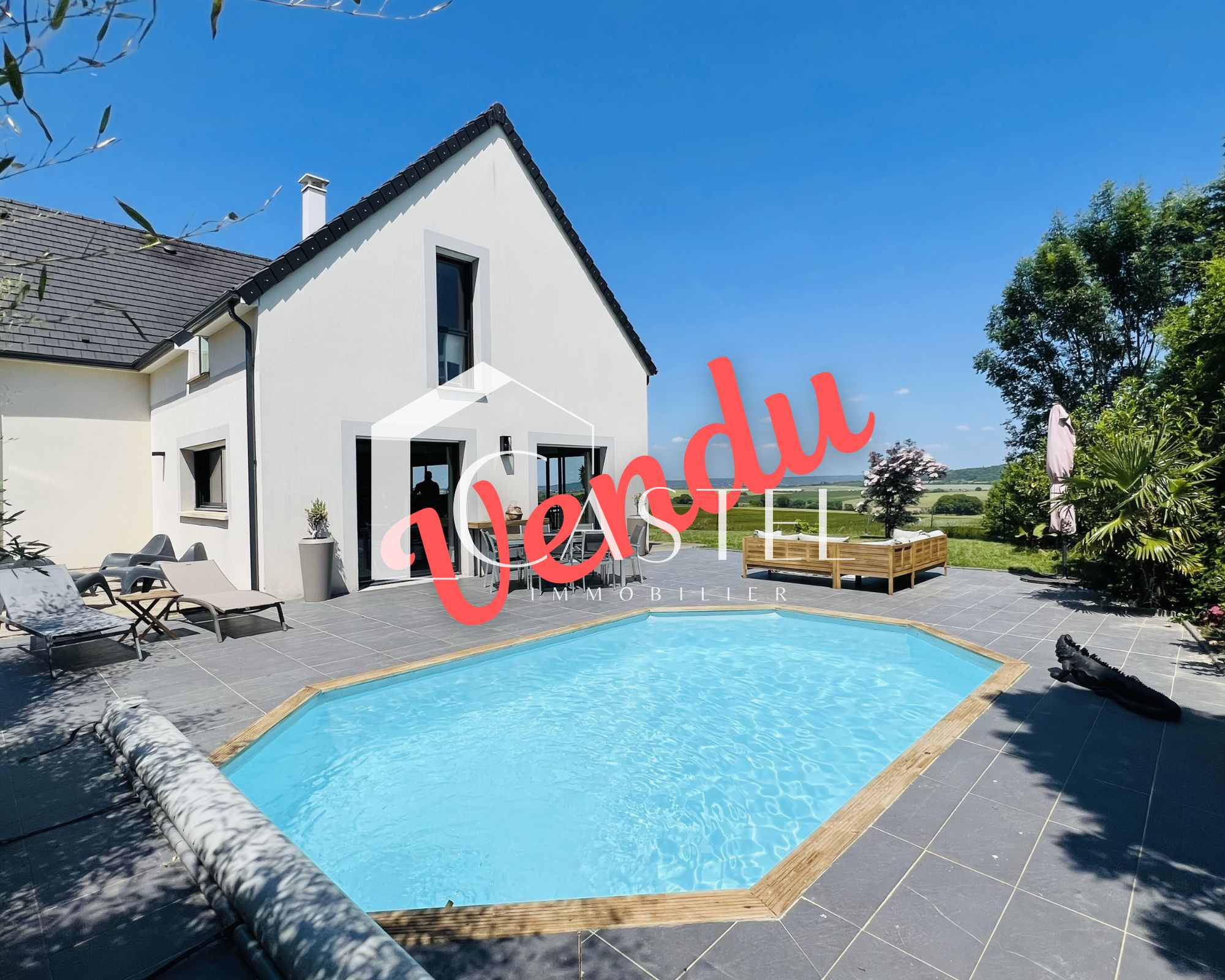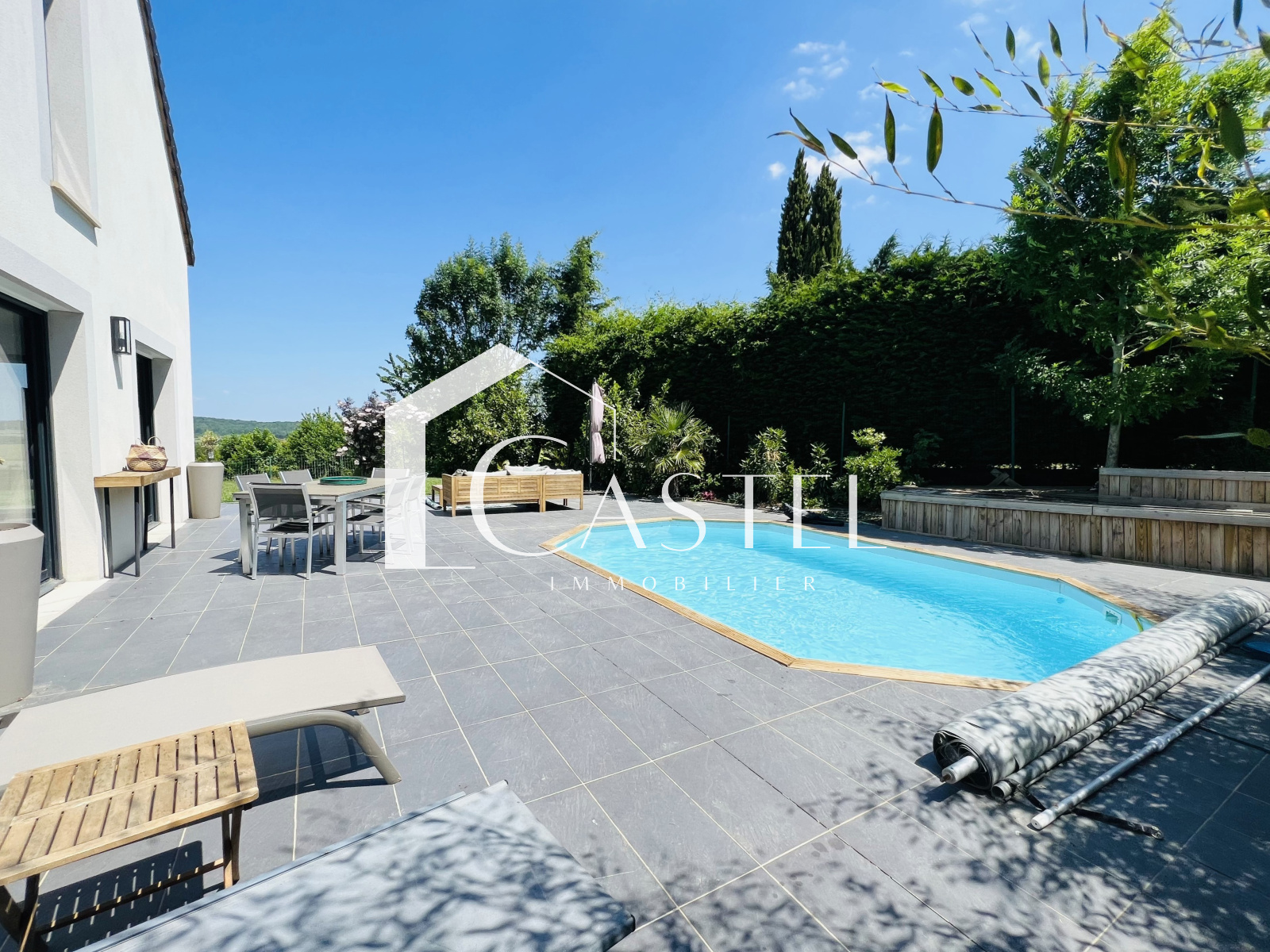 Vous pourrez passer vos douces soirées d'été sur les différentes terrasses ou au bord de la piscine chauffée, les amoureux de la nature seront comblés par la vue panoramique qui s'offre à eux depuis la maison.