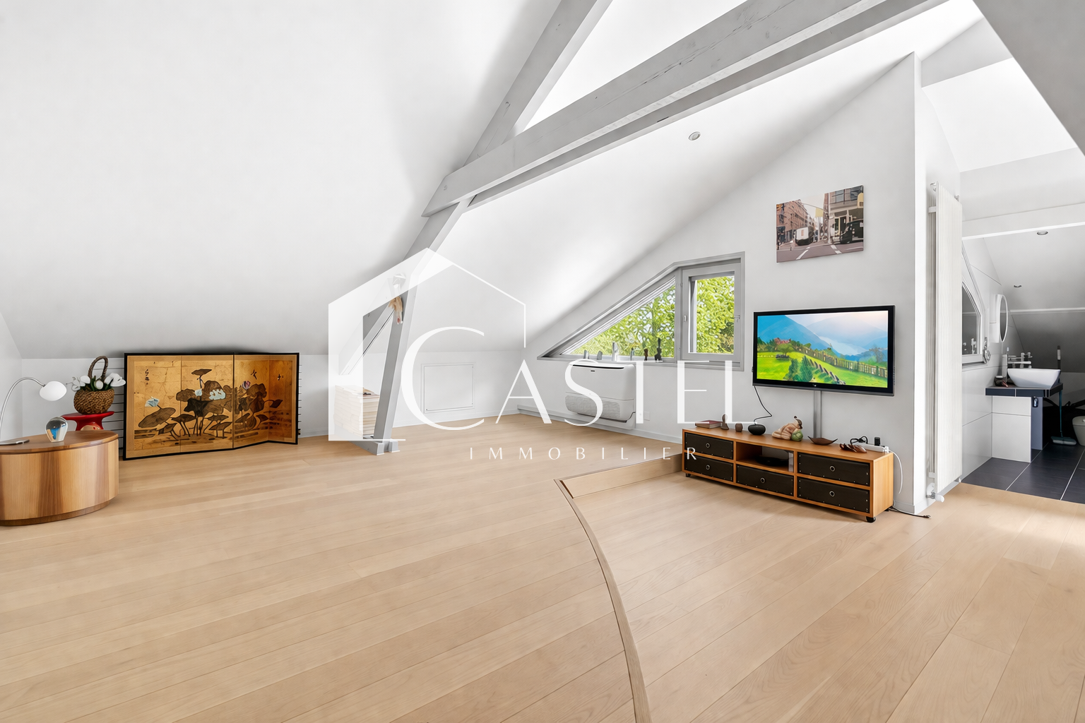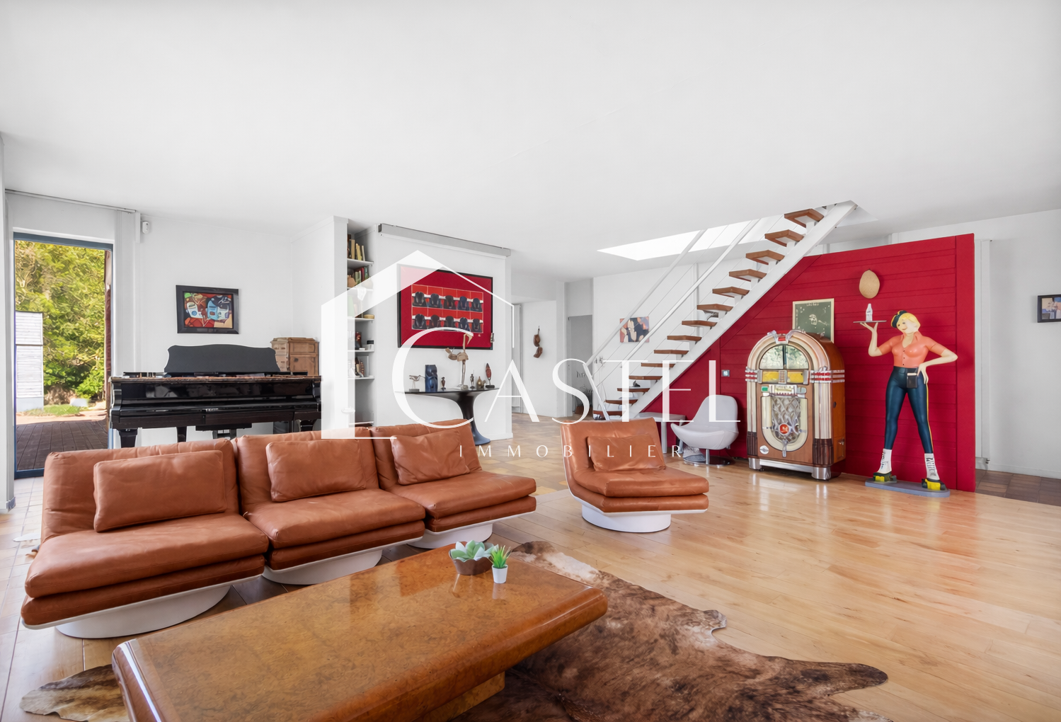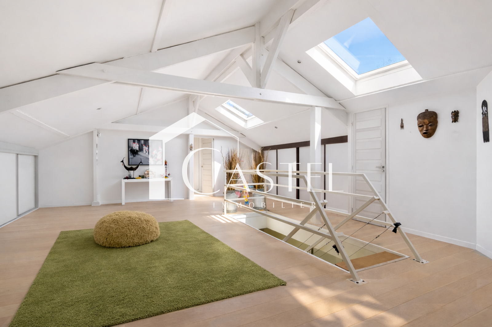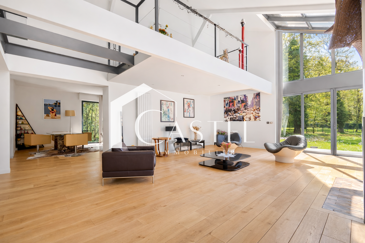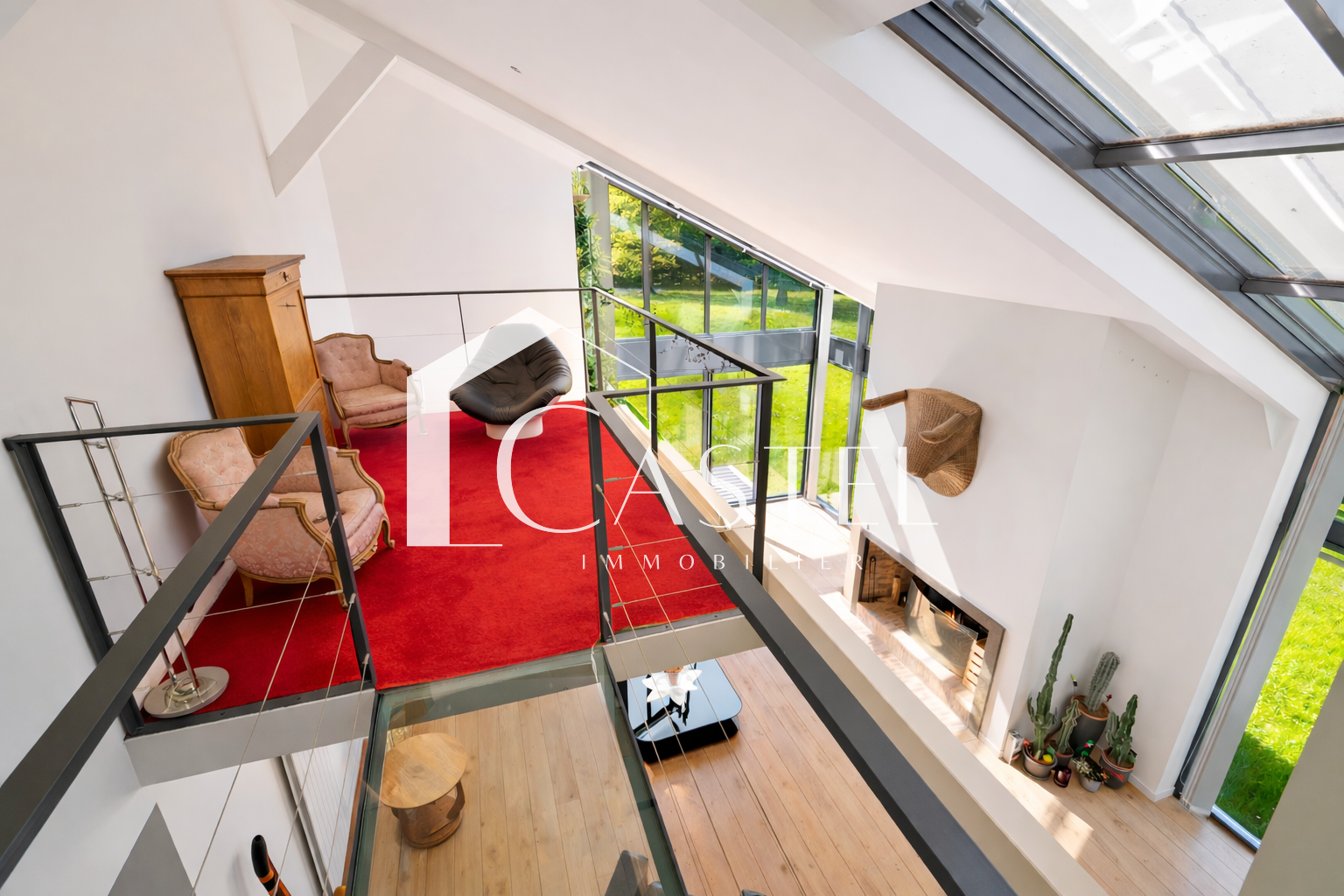 Au-dessus de la réception, une mezzanine lumineuse accessible par une passerelle surplombe l’espace de vie. Elle constitue un lieu idéal pour un bureau, une bibliothèque ou un espace détente.