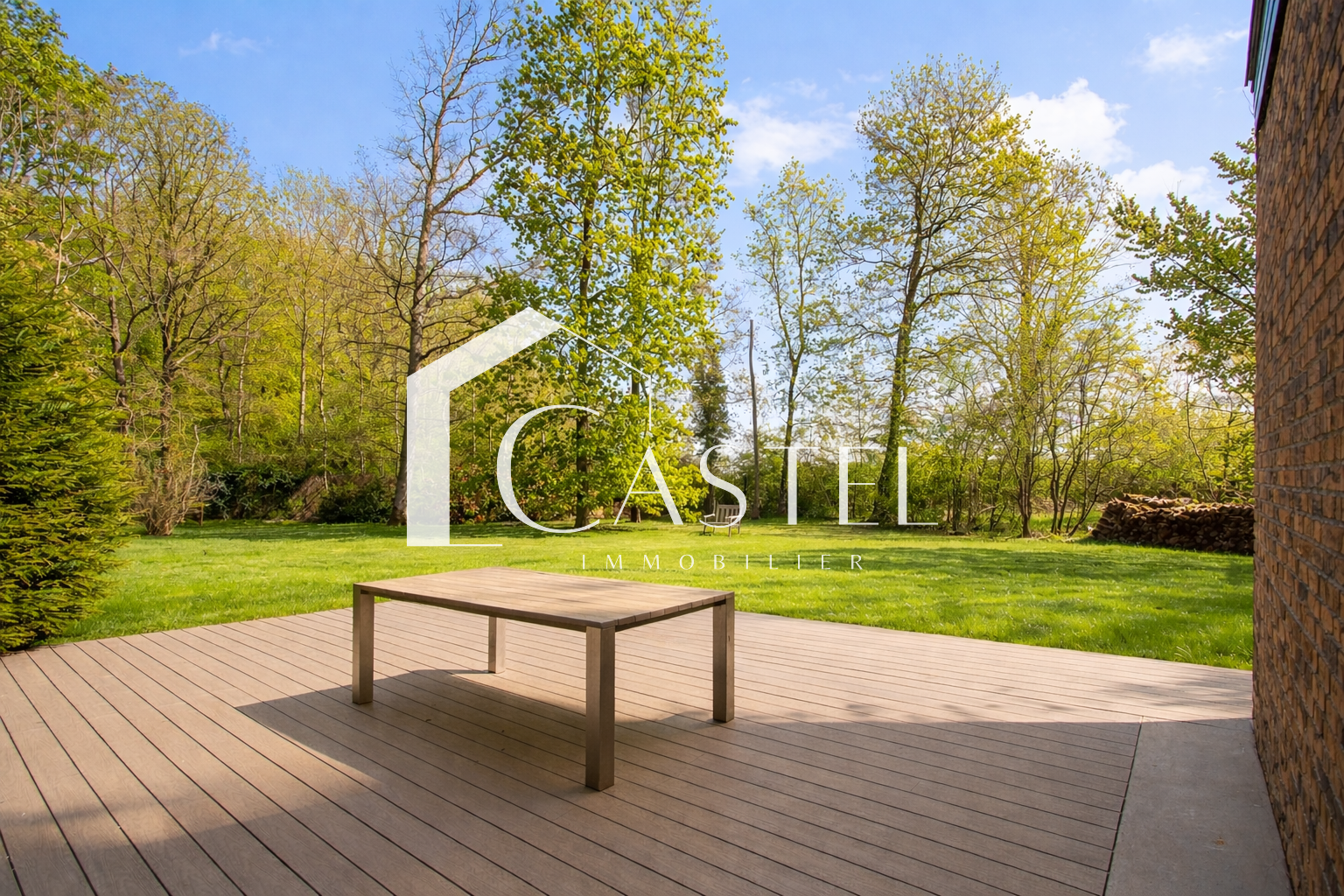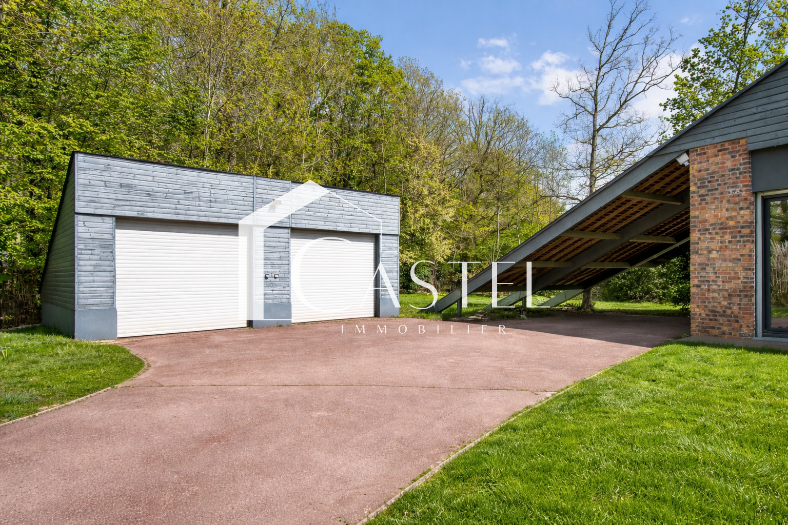 À l’extérieur, une terrasse en bois exposée sud-est permet de profiter pleinement du jardin arboré. Un abri de jardin, un carport (1 véhicule) et un garage triple d’environ 35 m² viennent parfaire les prestations.
